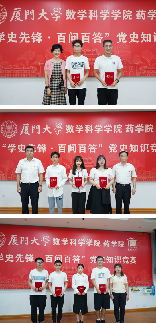 6月5日下午,数学科学学院与药学院在海韵园实验楼106报告厅联合举办“学史先锋·百问百答”党史知识竞赛。校党建巡察员、党史学习教育指导组第四组组长、数学科学学院党建联络员郑冰冰,数学科学学院党委书记黄宝秋,药学院党委书记陈怀锋,数学科学学院党委副书记丁昌利、党务秘书曹璐,药学院党务秘书冯民,数学科学学院团委书记于正伟、团委副书记陈淑铌,药学院团委副书记范荣出席本次活动。活动由数学科学学院硕士基础数学党支部刘畅、药学院本科生党支部郭妙婷主持。