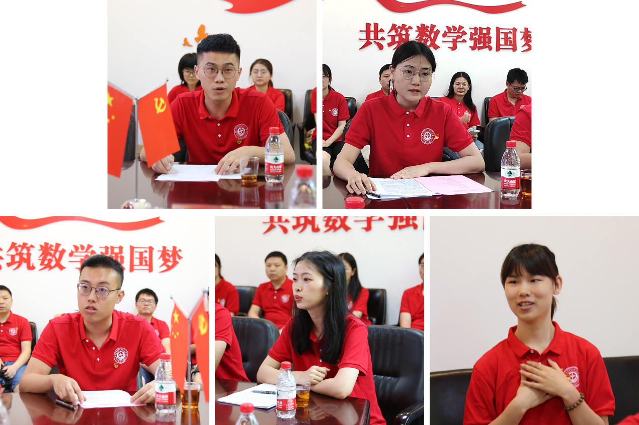 本科生党支部副书记、2017级本科生叶淑敏,第23届校研究生支教团成员、2017级本科生林瀚文,《哥德巴赫猜想》剧组演员、2017级本科生孟柯凡,第29届校研究生会执行主席、2018级硕士研究生林伟丰,厦门大学抗击新冠肺炎疫情优秀共产党员、2018级硕士研究生杨亚金作为毕业生党员代表发言。他们向辛勤付出的老师表达了真挚谢意,回忆了作为一名学生党员的成长经历,表达了对建党百年、建校百年的深情祝福。他们表示,作为数学科学学院的毕业生党员,作为“景润青年”的传承者和“景润先锋”的接力者,要在今后的学习工作中继承和发扬不怕困难、勇攀高峰的科学精神,秉承“自强不息,止于至善”的校训精神,用厦大“爱国、革命、自强、科学”的优良校风勉励自己,坚守初心,赓续前行,以实际行动为母校增光、为党旗添彩。