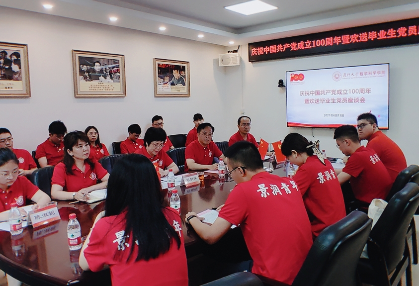 6月15日下午,数学科学学院庆祝中国共产党成立100周年暨欢送毕业生党员座谈会在海韵园行政楼B313会议室举行。厦门大学党委常委、副校长邓朝晖,学院党委书记黄宝秋,党委副书记丁昌利,团委书记于正伟,团委副书记陈淑铌,辅导员华盈鑫,26名2021届毕业生党员代表共同参加活动。丁昌利主持座谈会。