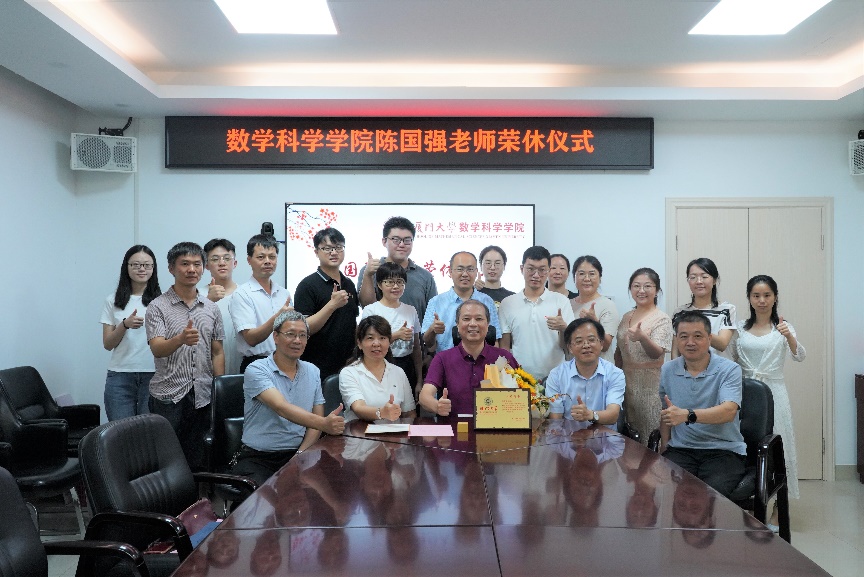 7月23日上午,数学科学学院在海韵园行政楼313会议室为今年7月退休的陈国强老师举行荣休仪式。学院党委书记黄宝秋、副院长邱建贤、工会主席伍火熊、妇委会主任吴聪敏,学校人事处专员蓝亦芃,学院教师代表、党政管理人员代表、学生代表共同参加本次活动。仪式由学院党委副书记丁昌利主持。