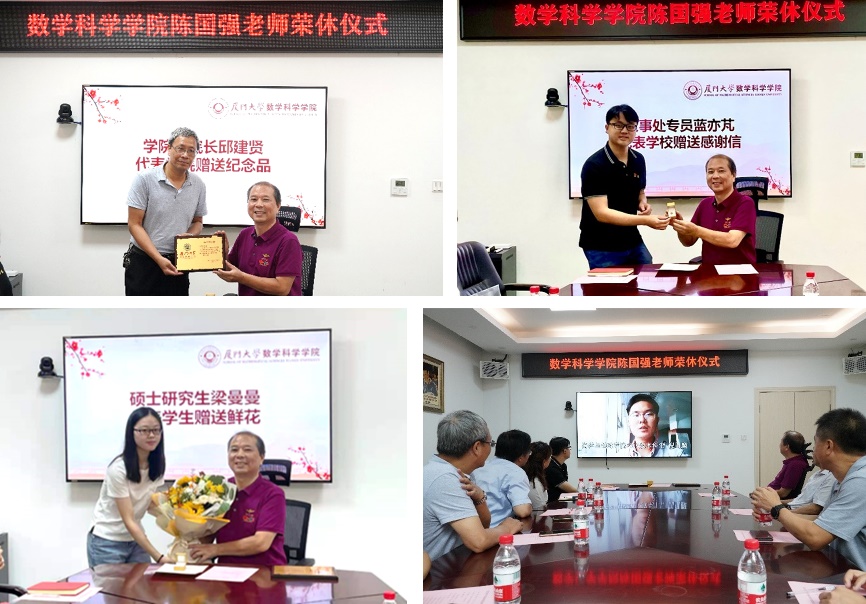 蓝亦芃代表学校宣读感谢信并赠送纪念徽章。信中引用刘禹锡的“未到桑榆晚,为霞尚满天”,表达对陈国强老师退休后健康生活的美好祝愿,希望他一如既往地关心学校的改革与发展事业,共创厦大美好未来。邱建贤代表学院赠送学院定制荣休纪念牌。学生代表梁曼曼赠送鲜花,表达美好祝愿和诚挚感谢。现场还播放了学院学生工作组为陈国强老师精心制作的荣休祝福视频,陈老师曾经的同事、学生以及家属纷纷为其献上美好的线上祝福。