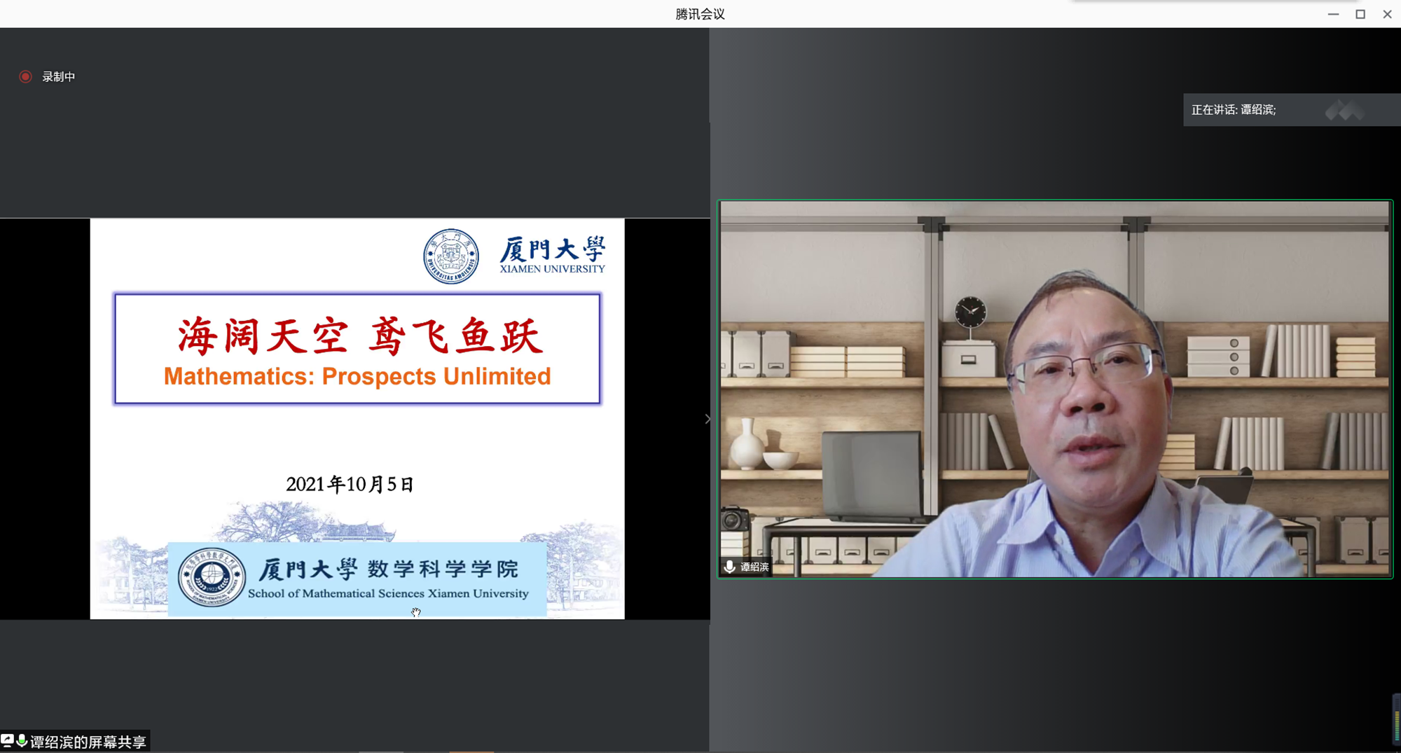 10月5日,数学科学学院院长谭绍滨教授为2021级全体本科生上第一堂新生研讨课。根据教学安排与疫情防控要求,本次研讨课在线上进行,数学与应用数学系副主任杜妮副教授、辅导员华盈鑫共同参加。