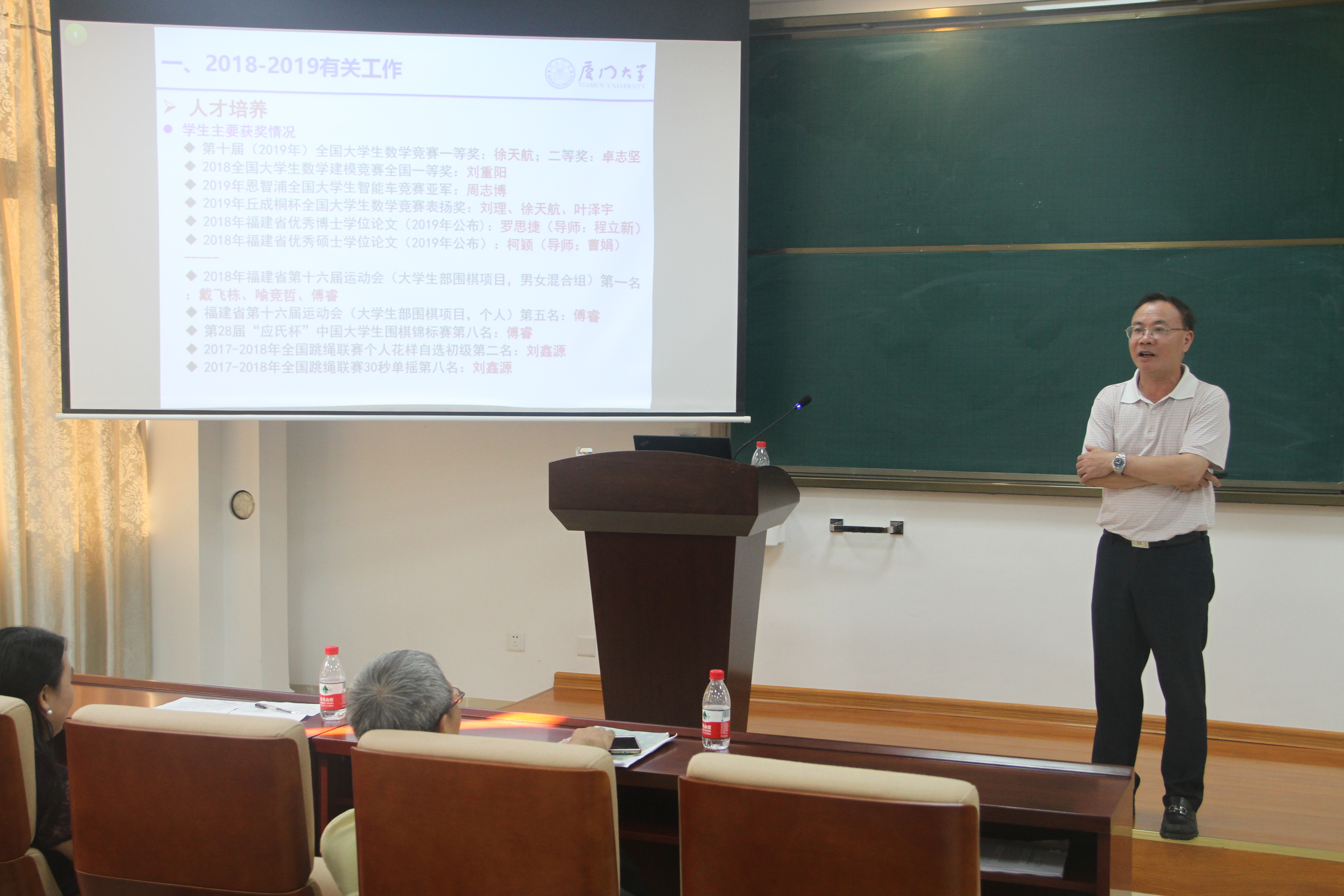 黄宝秋传达了学校近期召开的新学期工作布置会精神,介绍了2019年学校上半年行政工作、党建思政工作主要情况和下半年的重点工作部署,并就学院本学期几项重点工作特别是主题教育工作部署和开展国庆70周年庆祝活动等进行了说明,让全体教师更好地了解学校本学期的工作重点和要求,明确了下一步工作安排和努力方向。他指出,当前学校和学院推进“双一流”建设、推动高质量内涵式发展已进入关键阶段,我们要以开展“不忘初心、牢记使命”主题教育为契机,进一步团结带领全体党员和师生员工,坚持初心引航、使命铸魂,始终保持斗争精神和斗争能力,砥砺前行,团结奋斗,共同书写好厦大数学教育的“奋进之笔”和数学强国梦的时代篇章。