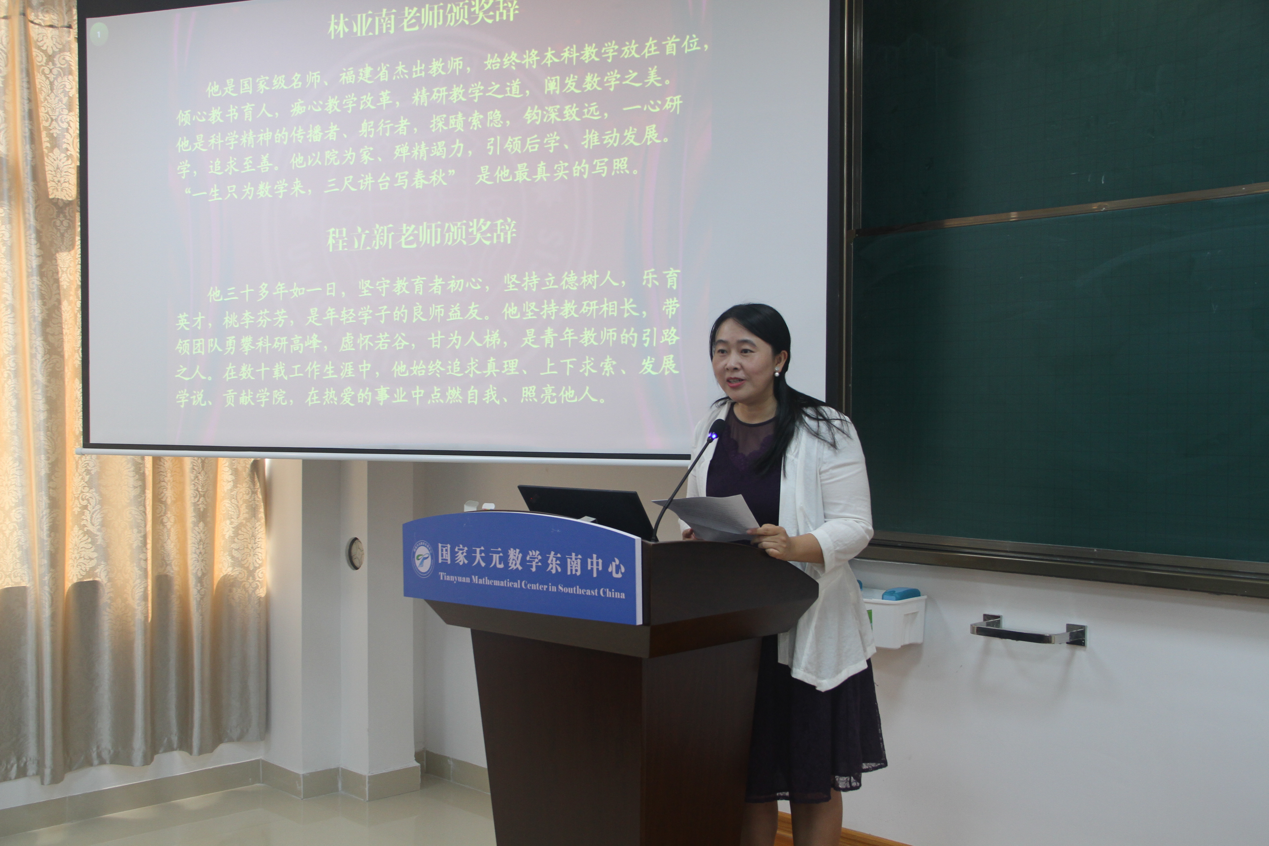 会上,首先由刘宁副书记代表学院宣读了本年度“白鹭”奖教金获奖名单,他们是:“白鹭”特别贡献奖获得者林亚南老师,“白鹭”奖教金获得者程立新老师、杜妮老师、白正简老师、陈淑铌老师、郭淑敏老师、陈李媛老师。会上还专门为每位获奖老师宣读了颁奖辞,黄宝秋书记和谭绍滨院长共同为获得2019年度“白鹭”奖教金获得者颁发荣誉证书。黄宝秋在讲话中指出,作为学院师德师风建设的重要举措之一,设立“白鹭”奖教金,既是对辛勤执教、潜心科研的教师和勤勉工作的管理人员的鼓励,也是在学院中树立起工作榜样,勉励全体教职员工以一流的状态努力为推动学院事业发展和“双一流”建设添砖加瓦。