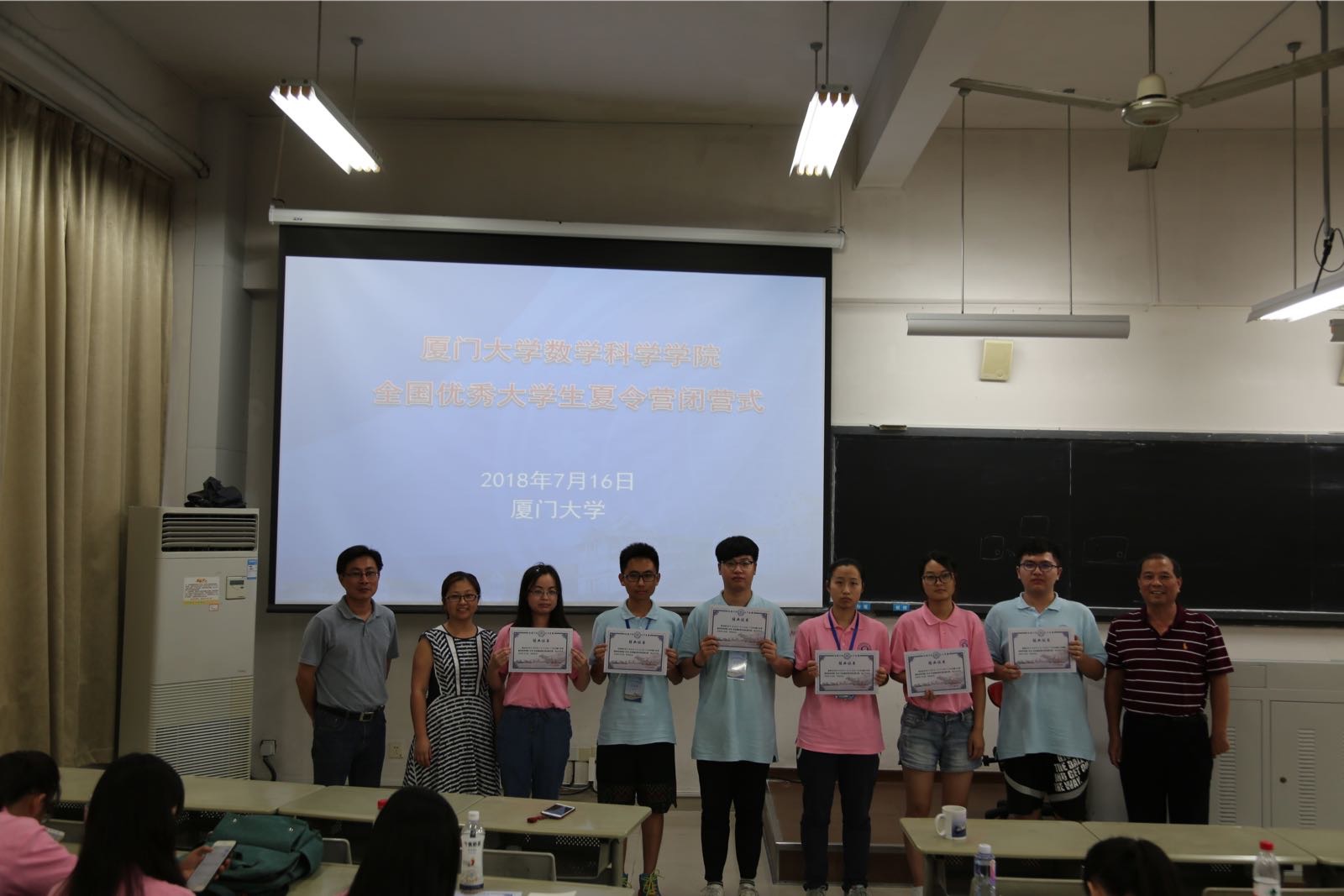 7月16日下午,全体营员参加了学长学姐经验交流会,来自我院的硕士研究生戚啸和彭思从校园生活和专业学习两个方面为营员们讲述了自己在厦大数院的切身体会和心得。会后举行了夏令营的闭营式,学院党委副书记陈国强对夏令营工作做了总结,并再次希望营员们加盟数学科学学院。闭营式上,陈国强副书记、张剑文教授和辅导员陈淑铌一同为营员颁发了结业证书。通过几天的活动,同学们对厦门大学、厦门大学数学科学学院、数学学科各研究方向和发展前沿有了更深入的了解,而且根据自身的情况逐步清晰了自己深造学习的目标规划,许多同学纷纷表达了希望到厦门大学继续深造学习的强烈愿望。