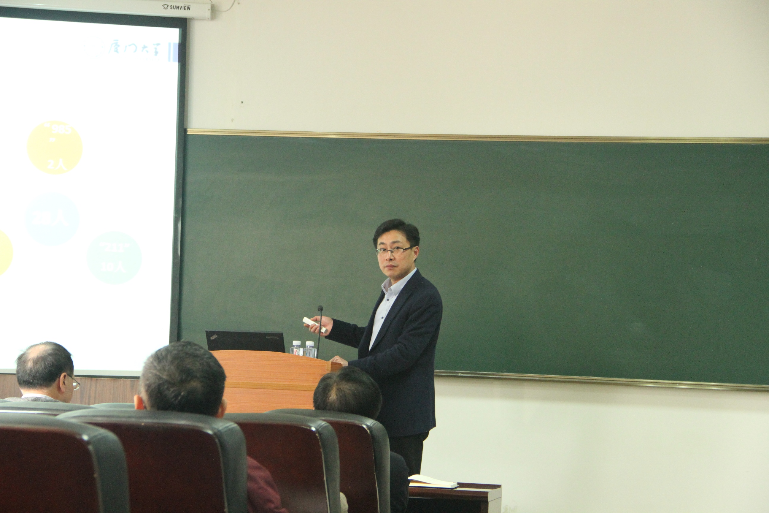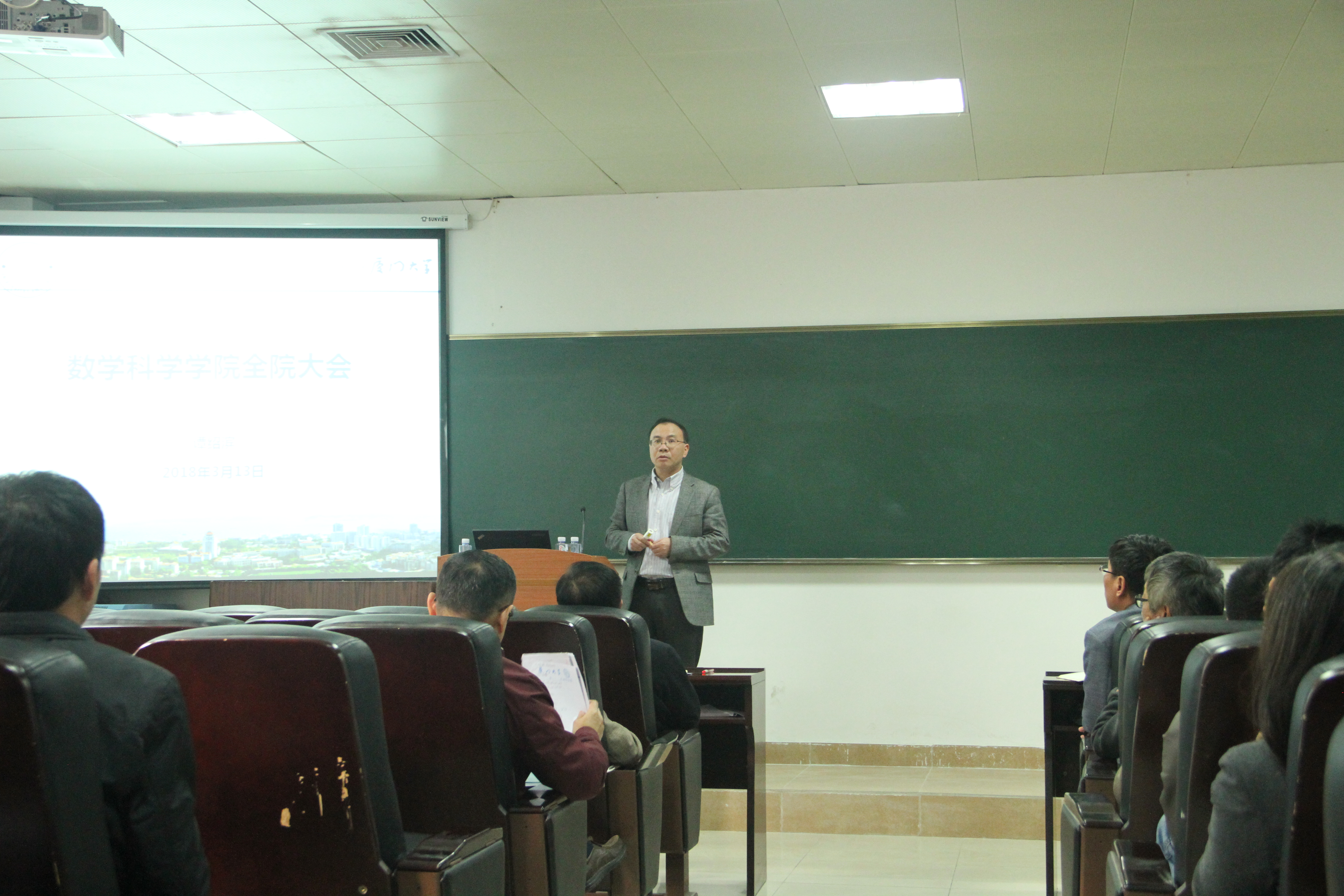 谭绍滨院长向全体教师报告了2017年度学院财务收支情况,分析了我院数学学科在第四轮学科评估中的情况,深刻剖析学科建设发展态势,向全体教师通报了申报“天元数学东南中心”的有关情况,传达学校绩效评价体系改革精神,并结合学院的基本情况和“双一流”建设提出今后的建设思路和举措,他希望全院教职工要牢固树立危机意识和竞争意识,群策群力、锐意改革,推动学院各项事业在新的起点上可持续健康发展,努力在“双一流”建设中展现新作为、创出新业绩。