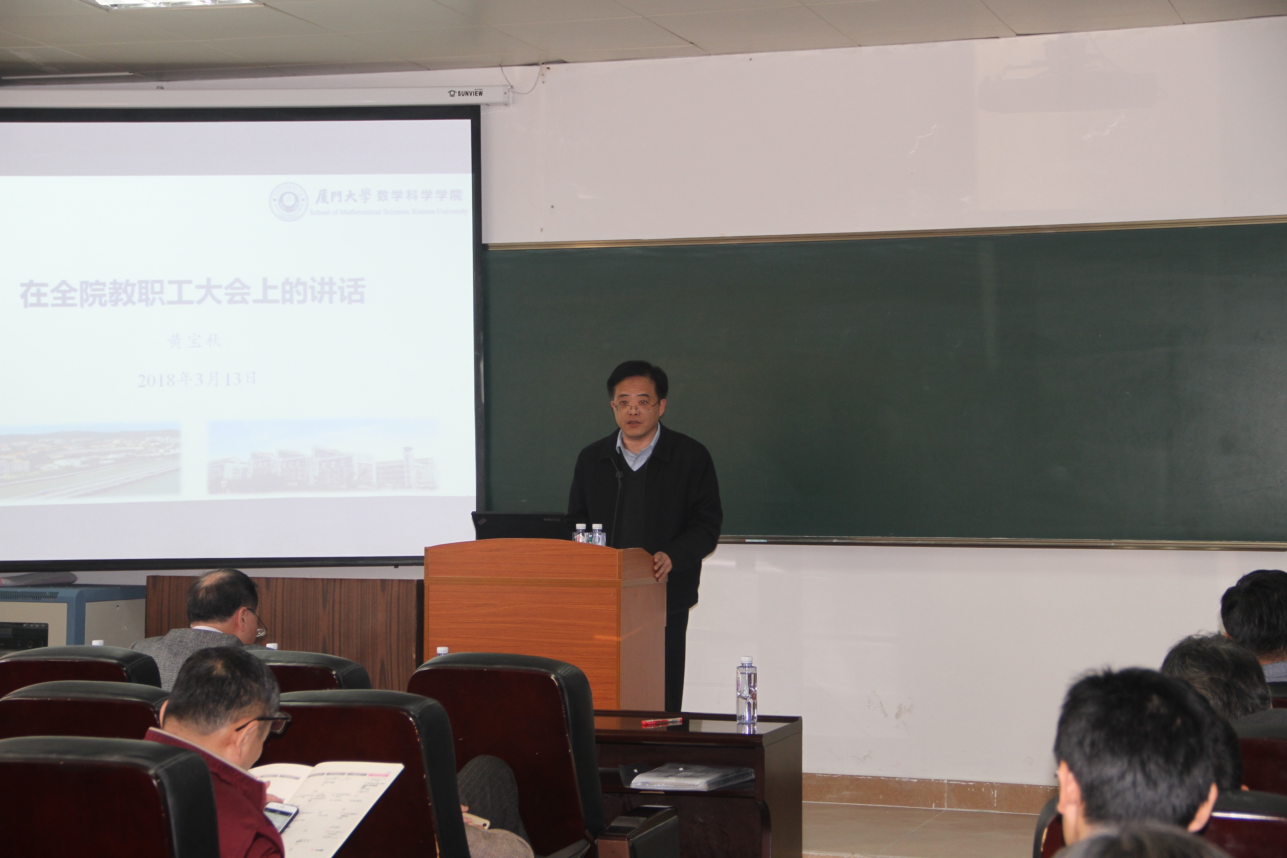 黄宝秋书记传达了学校2018年工作布置会精神,让全体教师更好了解学校新一年的工作重点和要求,向全体教师报告了学院党委2018年将开展的主要工作并做总结发言。他强调,今后一个时期学校“双一流”建设的蓝图已经绘就,学院今年的主要工作也已经明确,学院党的建设和事业发展既面临着良好机遇,又充满了挑战,全院上下要深入学习贯彻党的十九大精神,以习近平新时代中国特色社会主义思想为指导,认清形势、坚定自信,乘势而为、奋发进取,在争创一流的征程中作出数学人新的更大贡献。