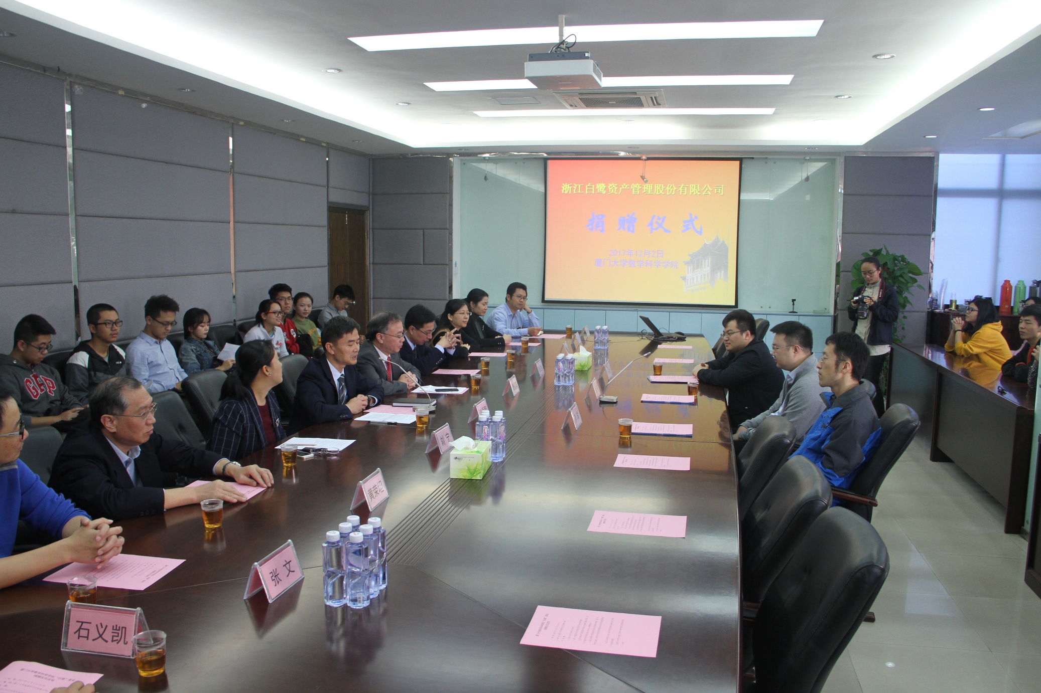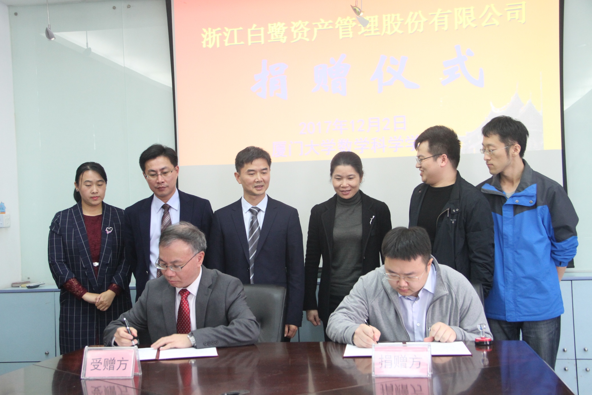 12月2日,厦门大学数学科学学院“白鹭”基金捐赠仪式在海韵园举行。学院2005级校友、浙江白鹭资产管理股份有限公司董事长兼总经理章寅先生、运营总监杨帆先生、我校校长助理、数学科学学院院长谭绍滨教授、学院党委书记张明智、副书记兼副院长张剑文教授、副书记刘宁、2005级任课教师代表、2005级校友代表李瑜博士及学院师生代表等参加了捐赠仪式,仪式由刘宁副书记主持。