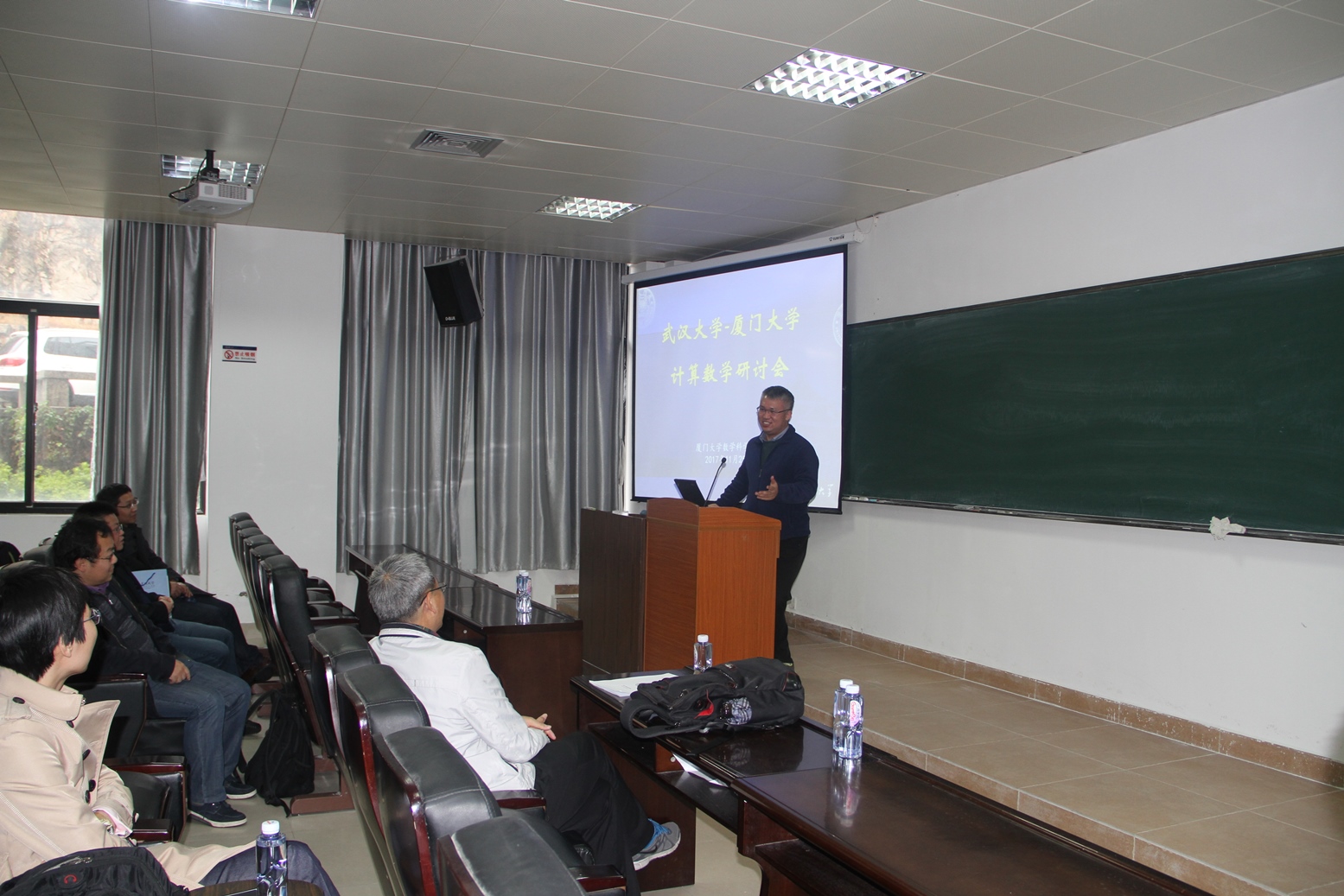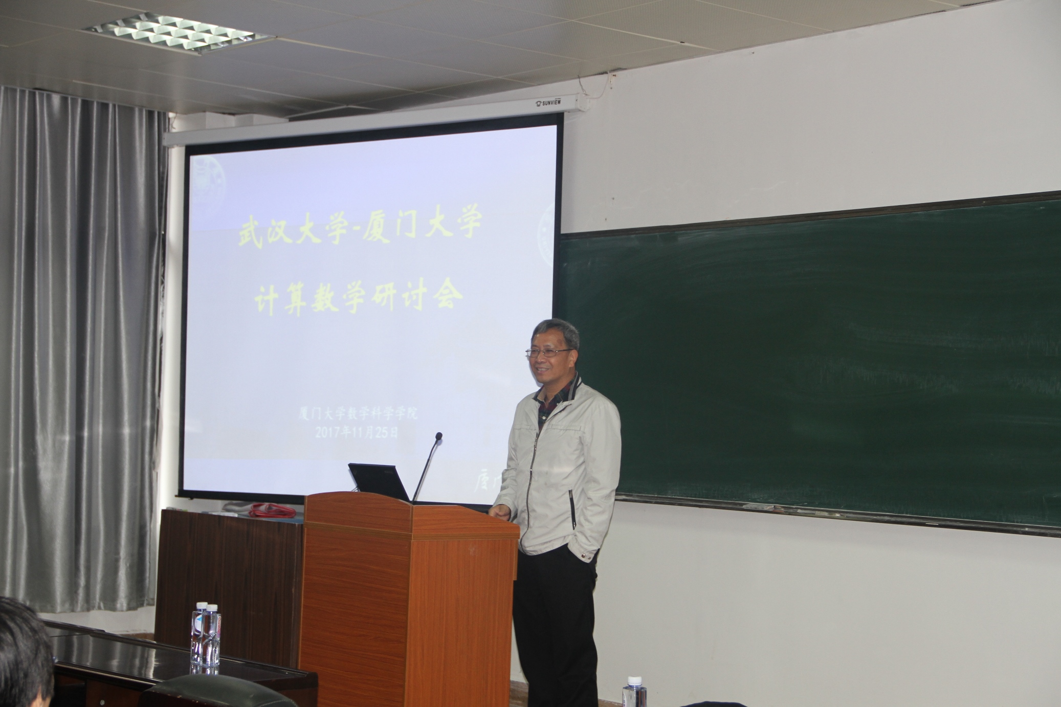 11月25日,武汉大学厦门大学计算数学研讨会在海韵园举行,两校的计算数学工作者共同为我院师生员工奉献了一场丰盛的学术盛宴。武汉大学数学与统计学院副院长杨志坚教授、信息与计算科学系主任吕锡亮教授、厦门大学数学科学学院副院长邱建贤教授、信息与计算数学系副主任杜魁副教授和两校的计算数学师生们参加了学术会议。