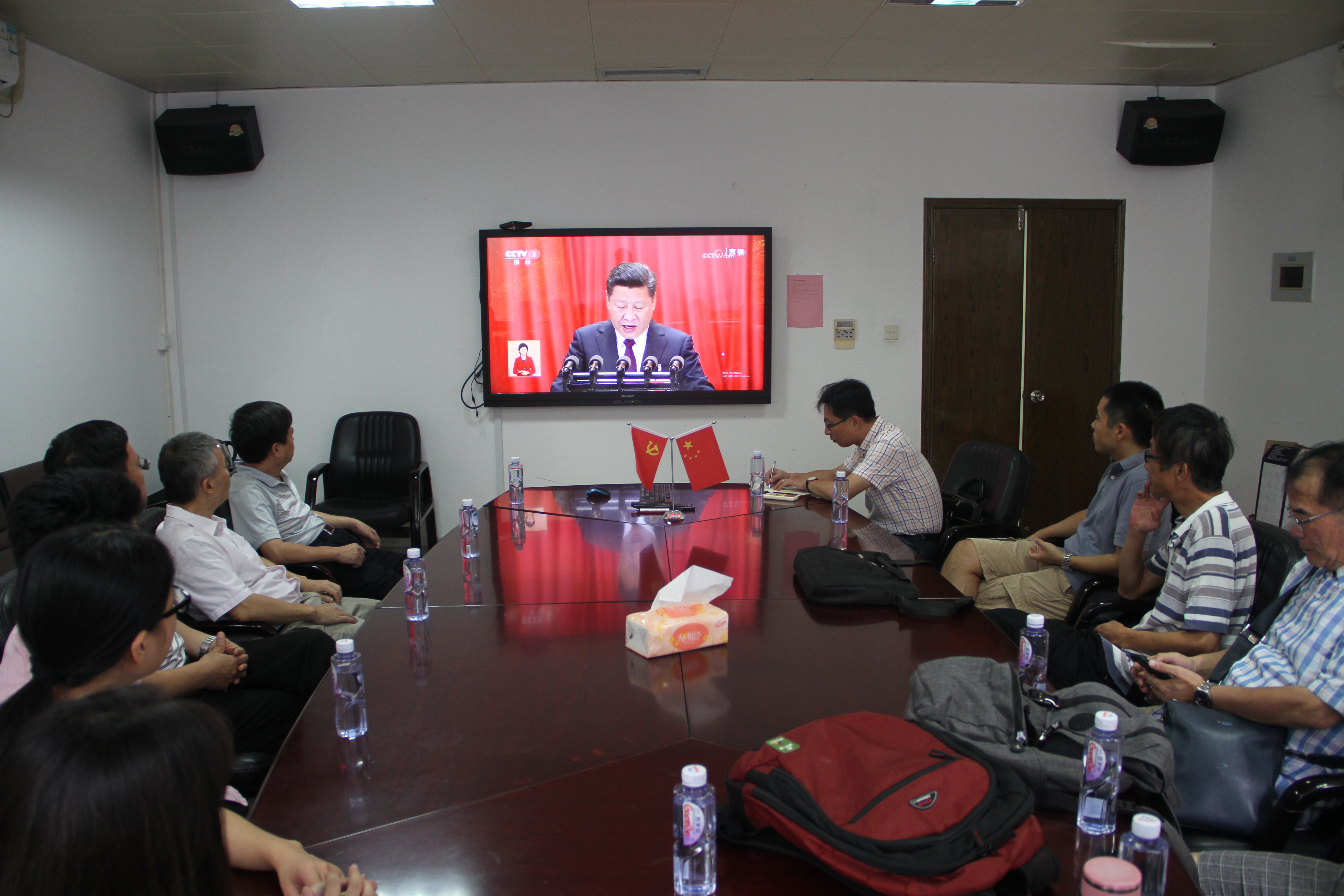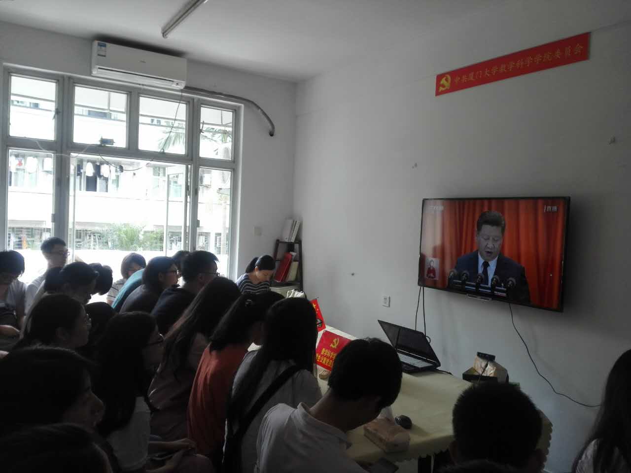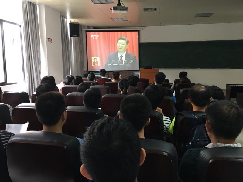 18日上午9:00,实验楼105教室、行政楼313会议室和海韵学生公寓党员服务站内,师生们济济一堂、精神振奋,一同聆听习近平总书记的报告。此外,行政支部受共建支部——国际处支部的邀请,与国际处全体工作人员在主楼820会议室一起观看了党的十九大开幕会。