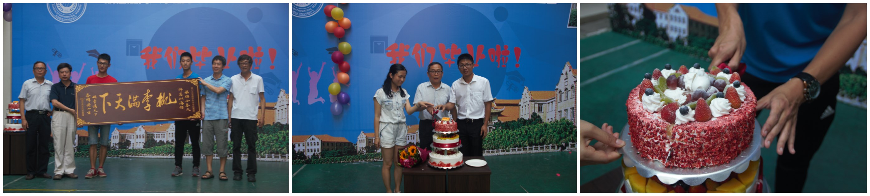 林亚南院长、蔡庆淞同学、胡志芳同学共同切开毕业蛋糕,祝所有的同学们一帆风顺,鹏程万里!