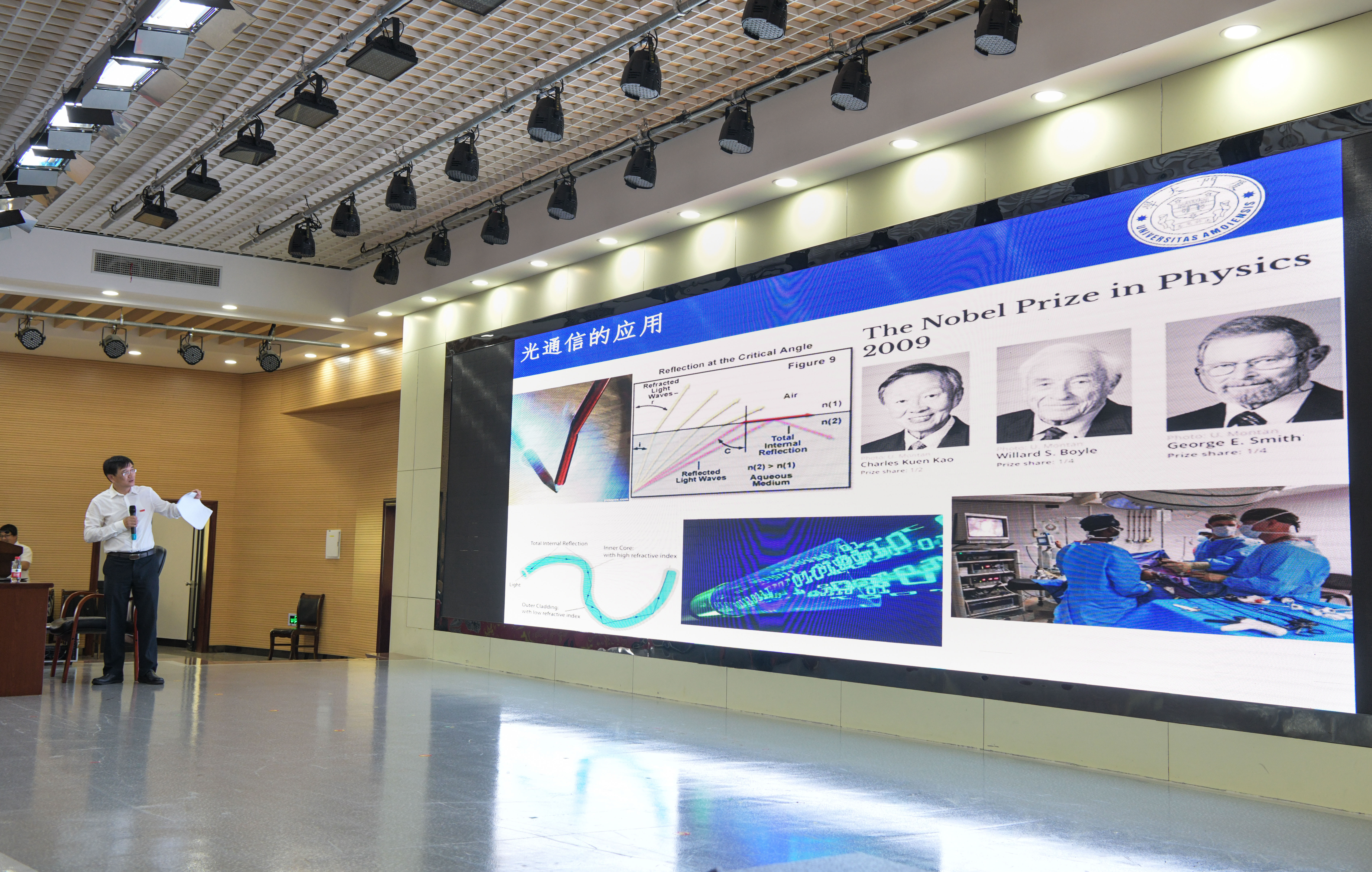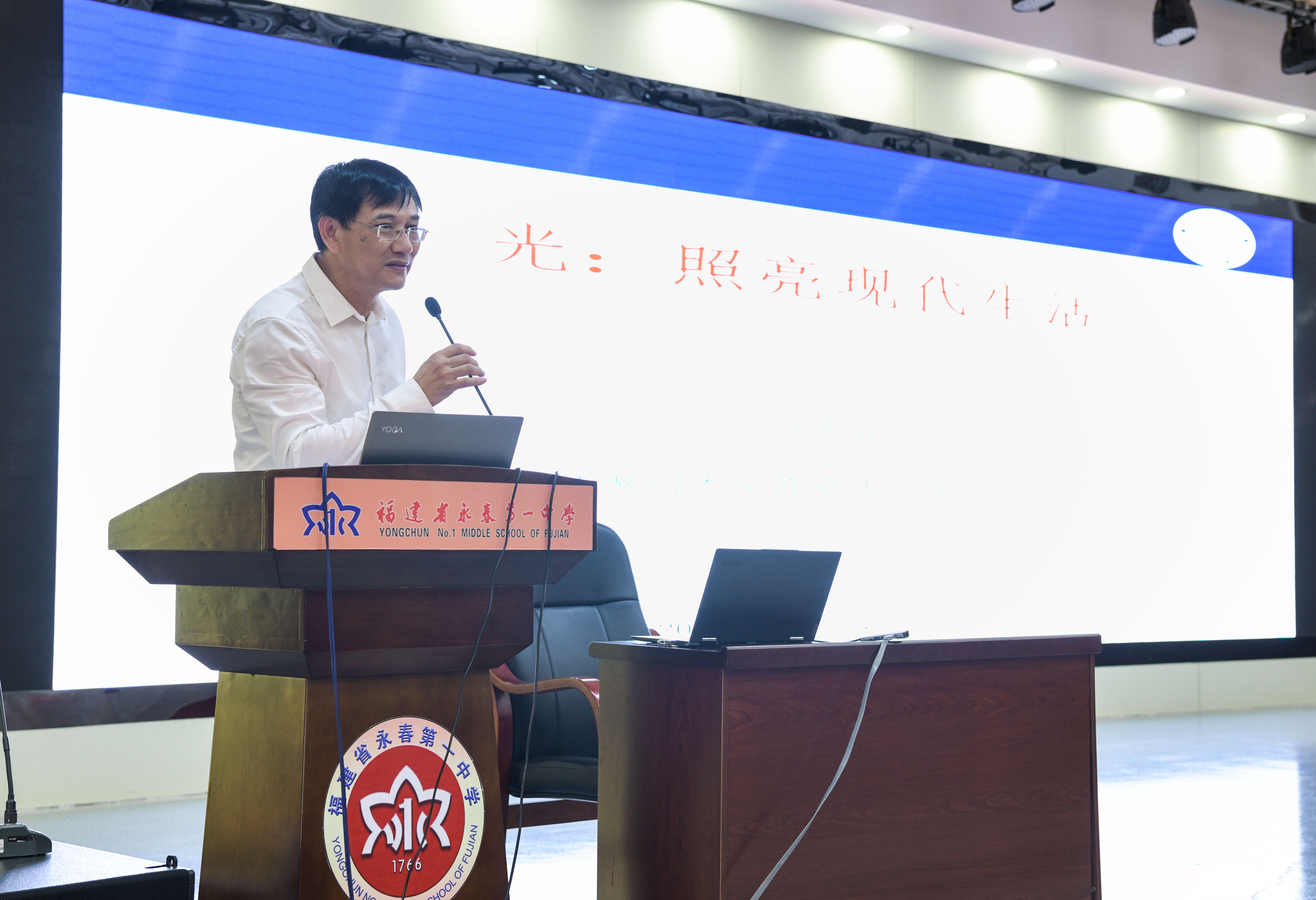 洪明辉院士进行了题为《光:照亮现代生活》的科普讲座。他详细介绍了光学基本原理和激光技术及微纳光学的应用前沿;通过医疗、交通、制造等领域的应用凸显了光学技术的神奇魅力,分析了当前激光技术的发展前景;并就光学微球显微镜、便携式表面增强拉曼光谱仪、激光清洁三个方面的研究成果向同学们展示了光学技术的发展与产业化应用前景。通过对前沿技术深入浅出的讲解,拓展了同学们的知识面,激发了同学们的求知热情。在互动与交流环节,洪明辉院士与同学们就光学知识、学习及科研经历等方面的问题进行了交流分享。会场气氛达到高潮。科普讲座后,洪明辉院士表达了对同学们的殷切期望,鼓励同学们努力学习,欢迎同学们到厦门大学研学,提高科学素养;洪院士进一步分享了厦门大学校主陈嘉庚先生的爱国之情,利用陈嘉庚先生倾资办学的事迹,向同学们展示了厦门大学优秀的校风,并欢迎同学们报考厦门大学,他将在中国最美的大学等待同学们的到来。