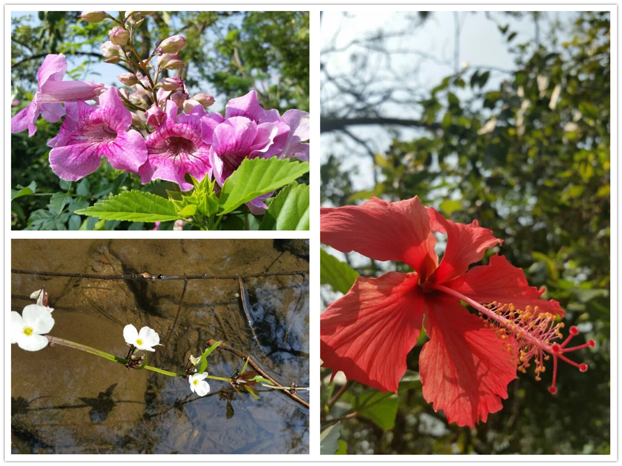 秋意浓,浓情上枝梢,花儿还是那样红,吐出花芯的扶桑花,红艳的紫蝉花,淡雅的无名小野花,在阳光下更显娇艳,惹得大伙驻足掏出手机拍不停。走到山上望海的绝佳处,远望前方,蓝天大海一线。俯瞰山脚,在山海环抱中,美丽的海韵园区映入眼帘,美不胜收。