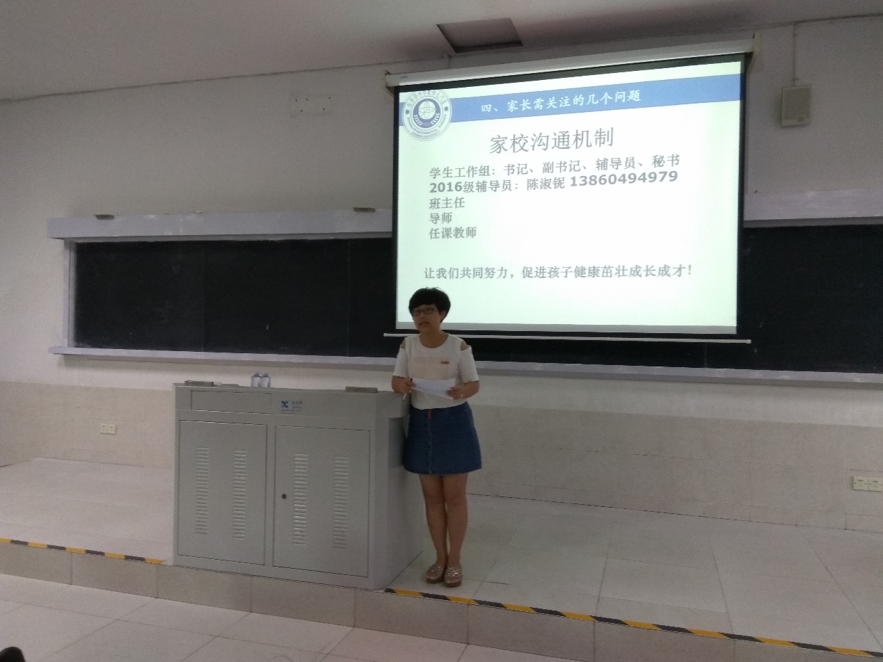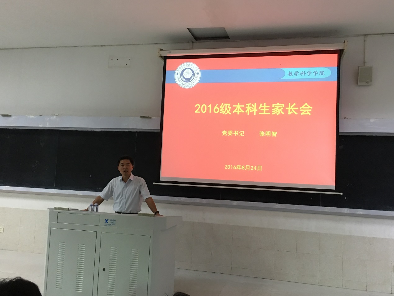 8月24日下午,我院2016级本科新生家长会在学生公寓教学楼105召开。参加会议的有院党委书记张明智、分管本科教学副院长钱建国、本科教学秘书黄晨龙、院团委副书记石义凯、辅导员陈淑铌以及各位新生和家长。会议由院党委副书记张剑文主持。