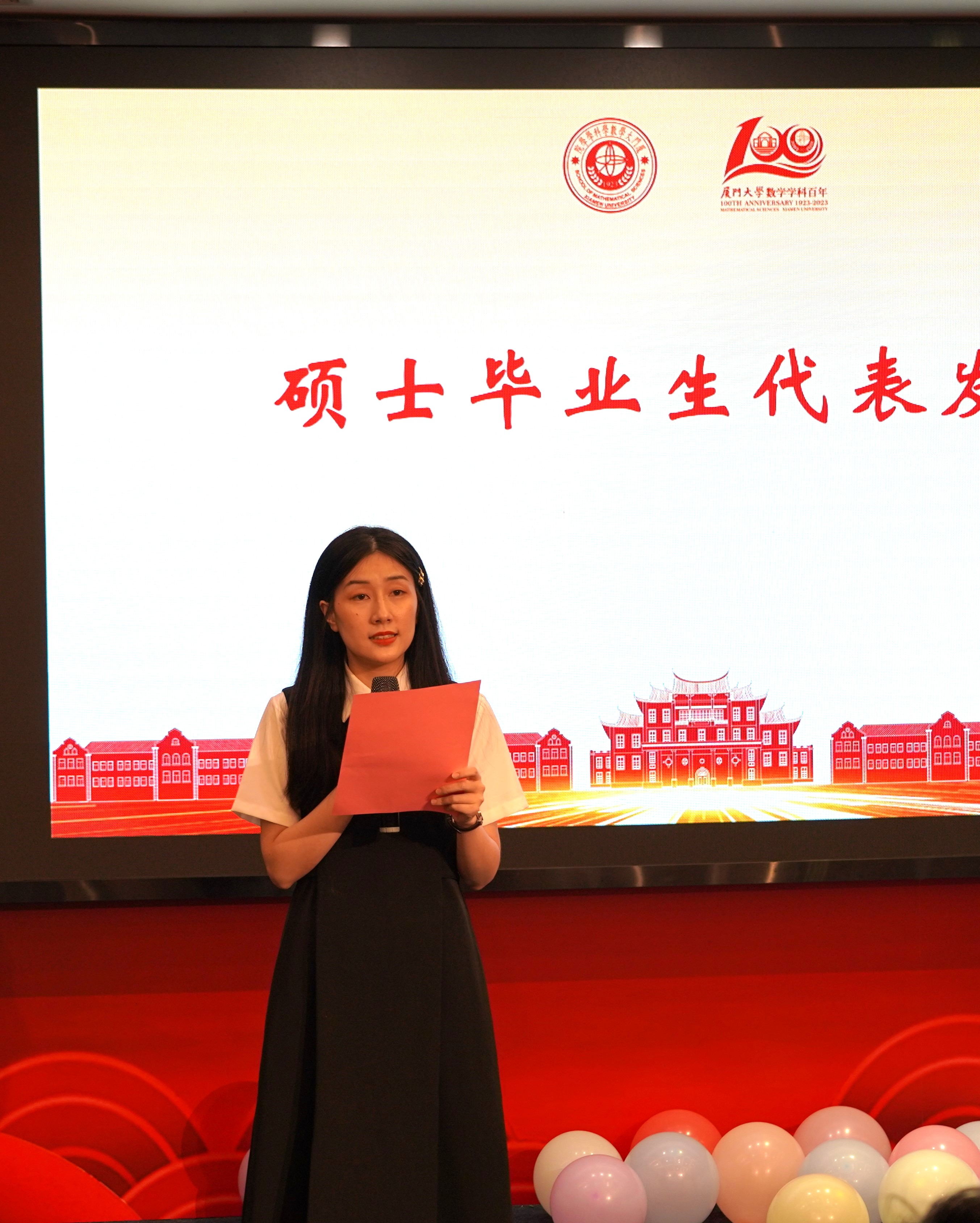 2019级本科生李龙泉、2020级硕士生严凌云、2018级博士生吴忠二代表学院2023届毕业生感谢母校、母院、师长与同学,回忆在数院的学习生活时光。他们表示,在学院的学习生活中,自己不仅打牢了专业知识基础,同时也树立起坚定的理想信念。他们即将从厦大出发奔赴祖国各地,未来将继续传承弘扬嘉庚精神,脚踏实地、勇毅前行,在各行各业发光发热,把个人奋斗融入国家发展大局,将青春播撒在广袤的祖国大地上。