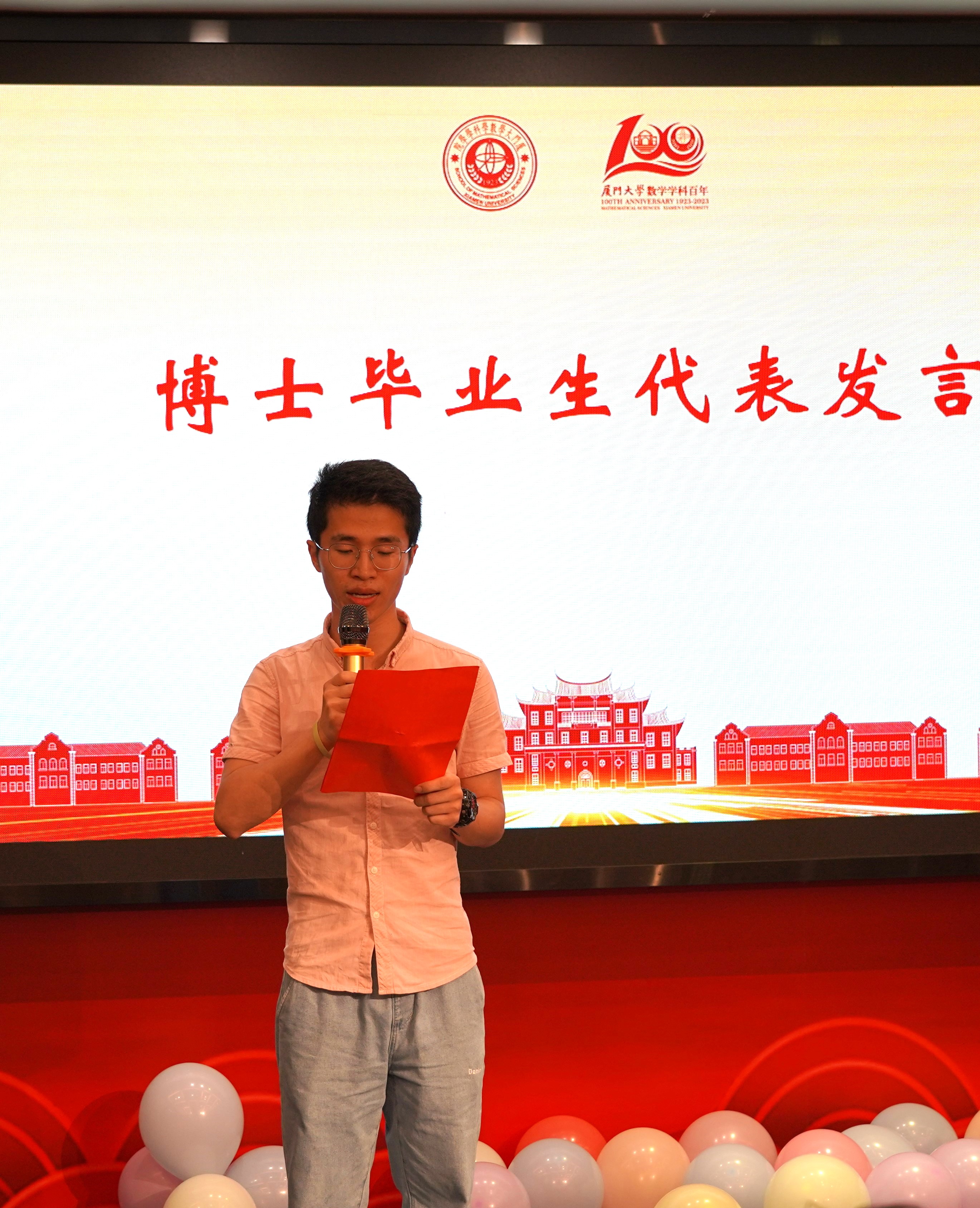 学院党委书记张清榕代表学院向全体毕业生表示热烈的祝贺与诚挚的祝福。他希望,作为新时代“景润青年”,同学们要积极响应时代号召,练就过硬本领,不断增长才干,前往党和国家最需要的地方,不惧危险,不怕挑战,在祖国大好河山画卷上书写属于青春最浓墨重彩的一笔。他表示,今年是厦大数学学科创建一百周年,同学们是于学科百年之际扬帆起航的一批毕业生,希望同学们能与百年厦大数学同频共振、同向同行,不忘母校嘱托,不负恩师厚望。