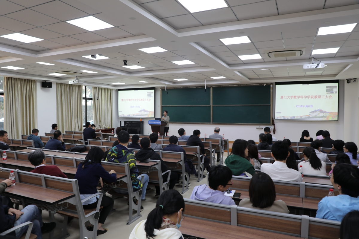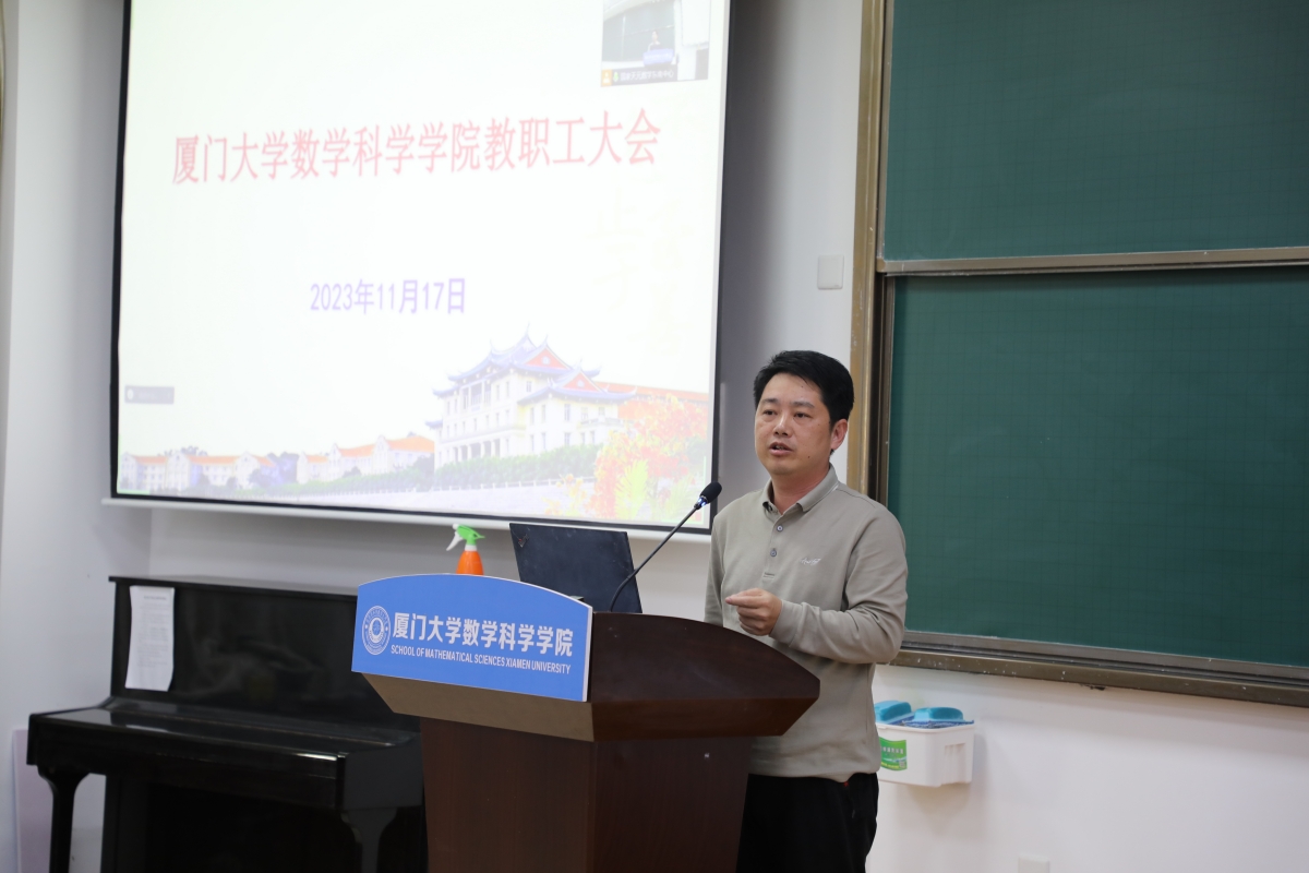 2023年11月17日下午,学院在海韵园实验楼106报告厅召开教职工大会,重点部署本科教育教学审核评估和举办数学学科创建100周年活动等相关工作。院党委书记张清榕主持会议。