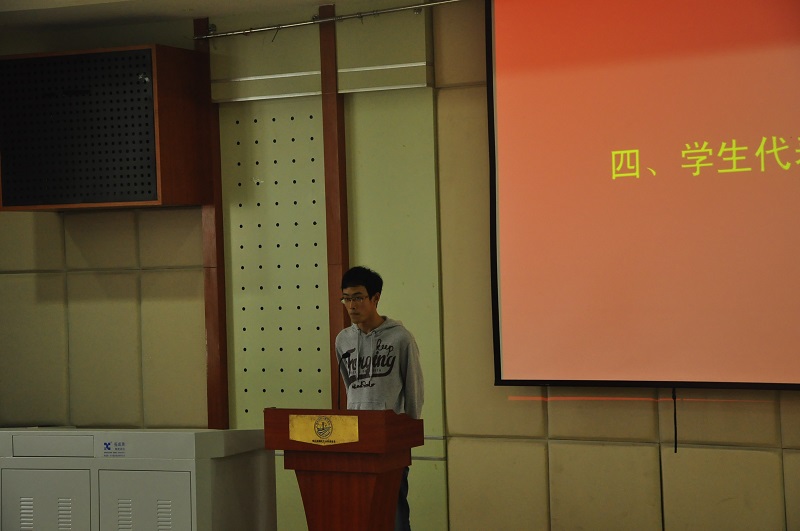 接下来,两位学生代表上台发言,他们分别是快乐学习奖学金获得者2013级本科生封立成 、数学科学学院优秀团支书2014级本科生陈亚雯。封立成同学在发言中提到,“奖学金对我们来说不仅是一种物质鼓励,更是一种精神上的认可,它激励着我们更加努力的学习。“陈亚雯同学则仔细的为我们介绍了团支部的各种丰富的活动,为我们展现出了这个团支部的活力与凝聚力。