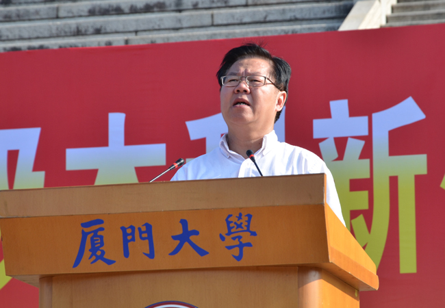 朱崇实首先致辞。他代表学校,向来自五湖四海的2014级4677名本科新同学表示热烈的欢迎和诚挚的祝贺,同时,也向培育新生们成长、并且帮助他们选择了厦大的家长、老师及亲友们表示衷心感谢和崇高敬意。