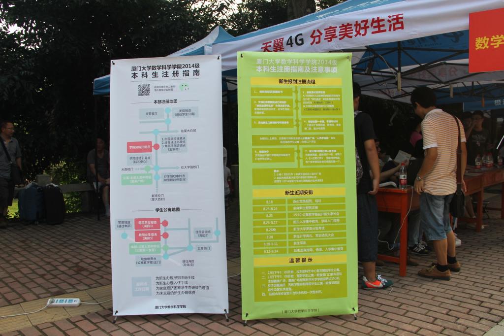 今年迎新我院有了很大的创新。首先,报到前一个月,微信迎新活动已经轰轰烈开启,迎新宣传更加绿色环保。微信的《关于迎新期间交通管制的通知》、《学生工作到底是什么?》、《厦大攻略?》、《首先,你得有一个旅行包》等一系列新生攻略给还未到的14级新生一个对大学生活的初印象。其次,新生qq群的建立,让学弟学妹与学长学姐有一个提前交流的平台,满足自己对大学的好奇心。最后,在学院网站主页上提前发布《2014级本科新生报到注册流程及注意事项》,让新生在报到之前就对整个流程都有一个清楚的了解。在迎新期间,我们还举行了为新生及其家长合影留念的活动,用相机为新生留下大学报到第一天这一值得纪念的一天。我院注册点的简易地图也是我院一大特色,并且附有二维码,新生和家长们只要“扫一扫”便可获得该地图的电子版,避免了自己“迷失”在厦大。