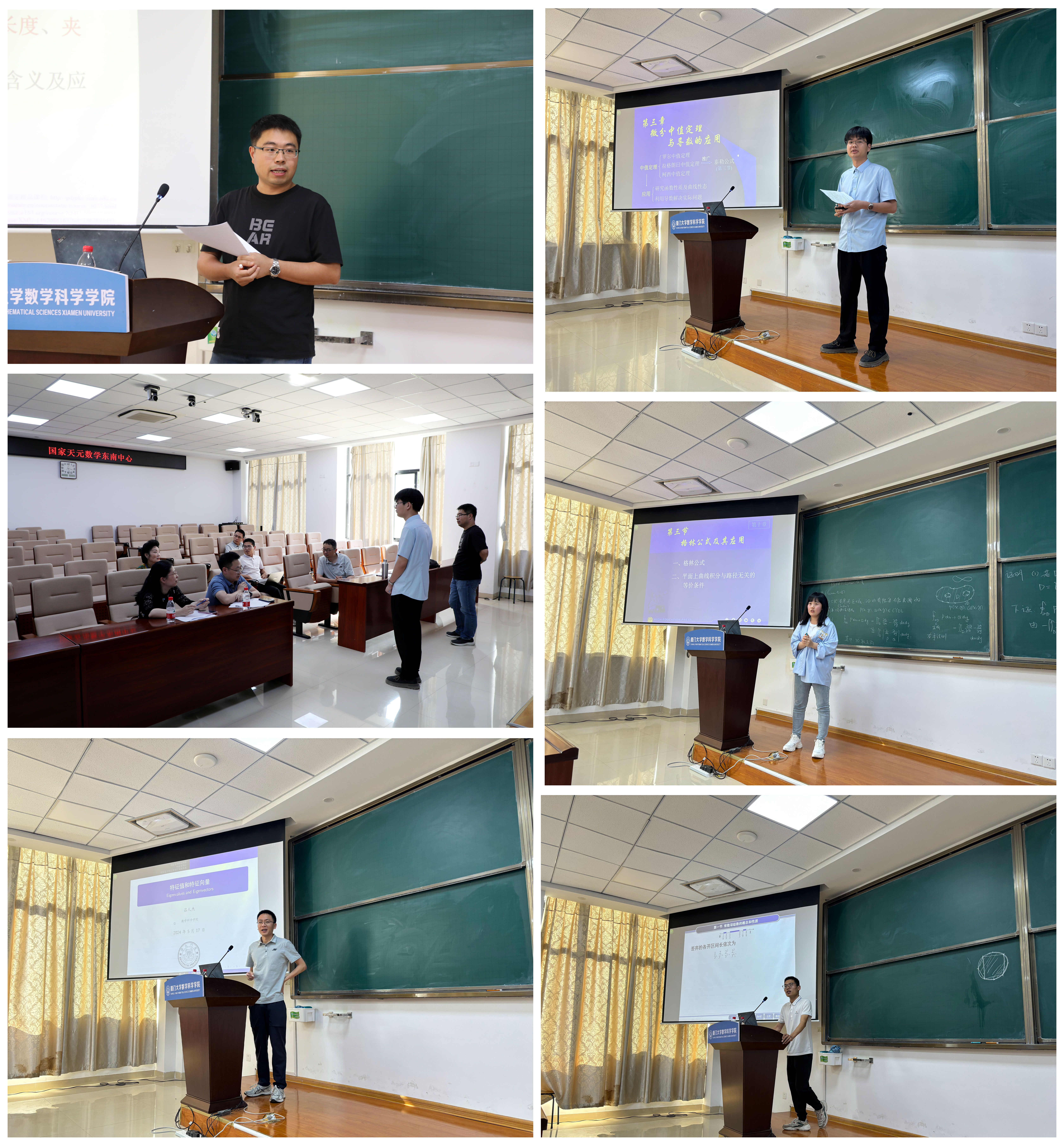 五位新进教师谭志裕、赵状、李彩燕、吕人杰和黄立鼎分别就高等代数和微积分中的有关主题进行试讲。考核小组对每位试讲老师的教案设计、教学内容、教学组织、教学语言与教态、板书等方面做了点评,并进行打分。