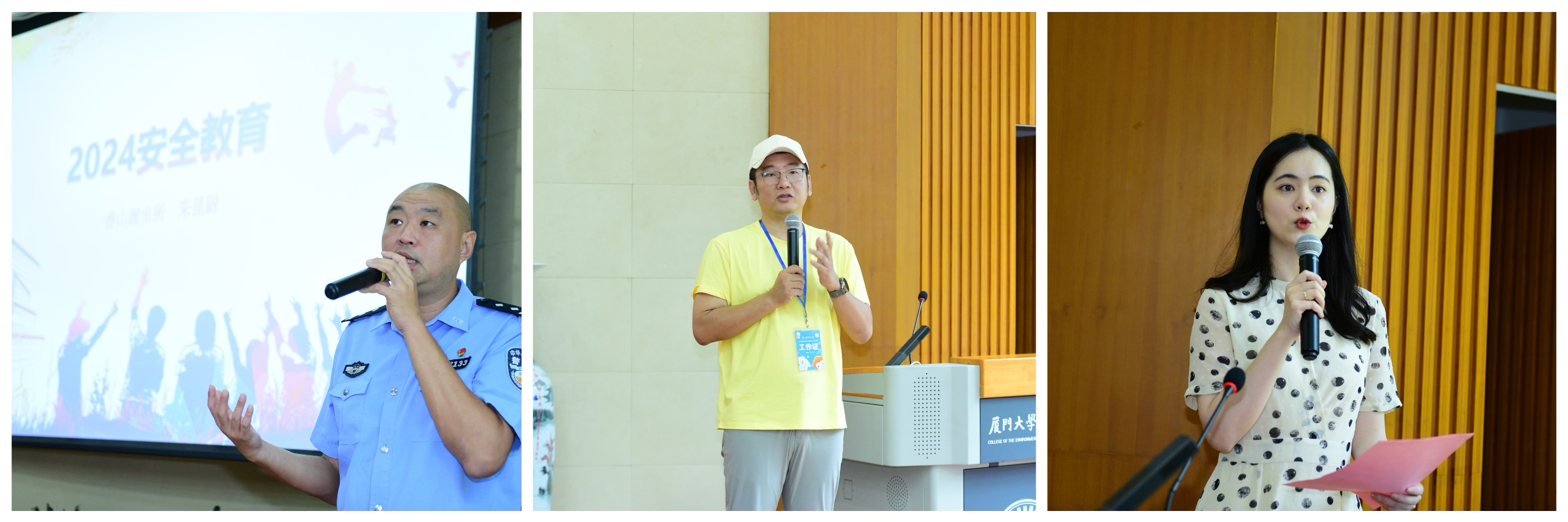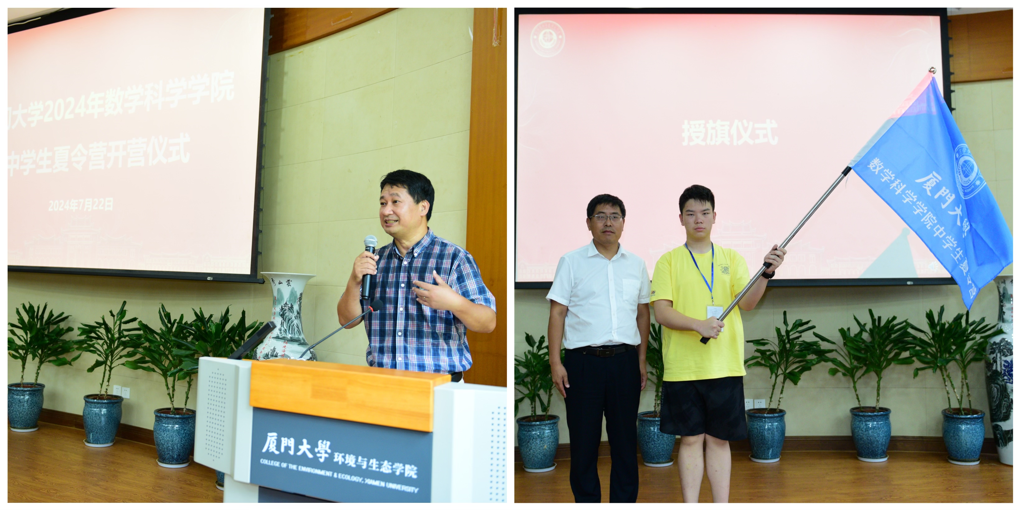 7月22日上午,2024年数学科学学院中学生夏令营开营仪式在翔安校区隆重举行。数学科学学院党委副书记毛通双、副院长金贤安、团委书记方晨亮、厦门市公安局香山派出所一级警长朱昆尉、辅导员张馨予及全体营员参加开营仪式,仪式由团委副书记许温洁主持。毛通双副书记致开营词,对营员们的到来表达热烈的欢迎,并鼓励营员积极参与活动,充分利用厦门大学优质教育资源,深入了解数学学科的魅力。金贤安副院长向营员代表授旗。朱昆尉警官从防火、防溺水、交通安全、人身安全等方面讲解安全知识,提醒营员们增强自我保护意识。带队班主任周亮介绍夏令营的日程安排和活动内容。