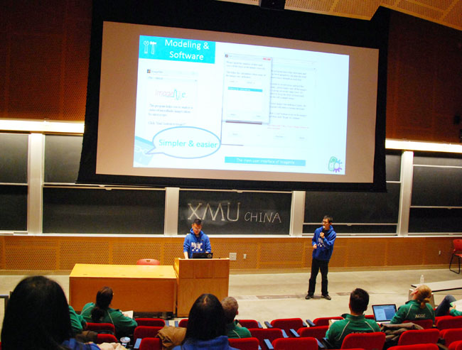 而首次组建参赛的厦大软件队由林屾(2012级化学)、洪昱旻(2012级数学)、张艺娟(2011级生物工程)、程晗(2011级化学)、黄剑兴(2011级化学),邱立楷(2011级智能科学)、黄新(2011级物理学)、黄江(2011级物理学)、韩涛(2011级物理学)和陈月桢(2011级电子科学)共10名本科生组成,由2013级生物化工专业研究生裘若桑带队,针对生物砖的优化过程设计了相应的计算评估软件,同时开发了一款全新的实验记录工具E’NOTE,首次参赛即受到了评委以及各学校参赛者的广泛关注,最终在麻省理工学院举行的比赛中获得iGEM金奖。