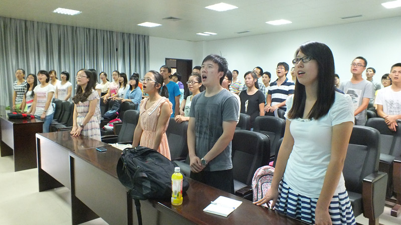 我院兼职辅导员、12级基础数学专业陈淑铌同学带领全体同学学唱校歌并为各位同学详细解释了每一句歌词的含义,使广大新生对我校的历史又有了进一步的了解。