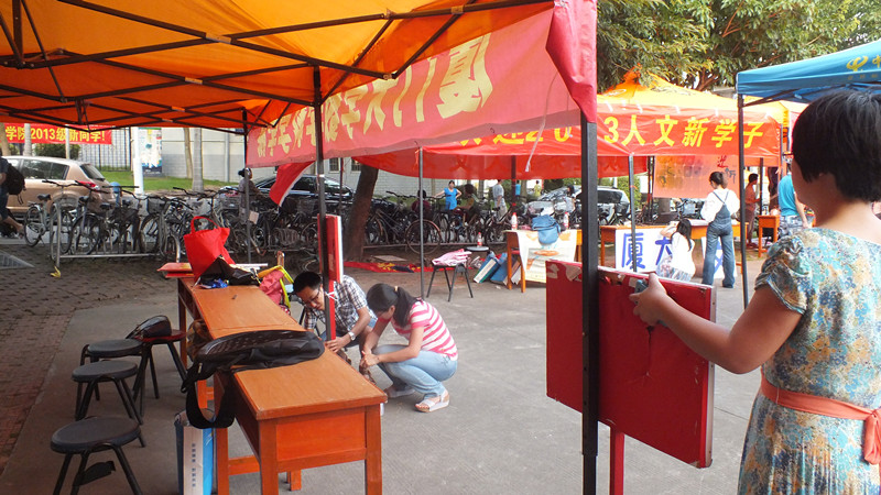 13日下午,研究生会的学生干部及志愿者们就到迎新现场布置,大家各尽其责,有的搬运桌椅,有的搭建帐篷,有的张贴横幅及迎新海报……各项工作都在有序在进行着。到傍晚时候,学院迎新点准备工作也基本就绪。