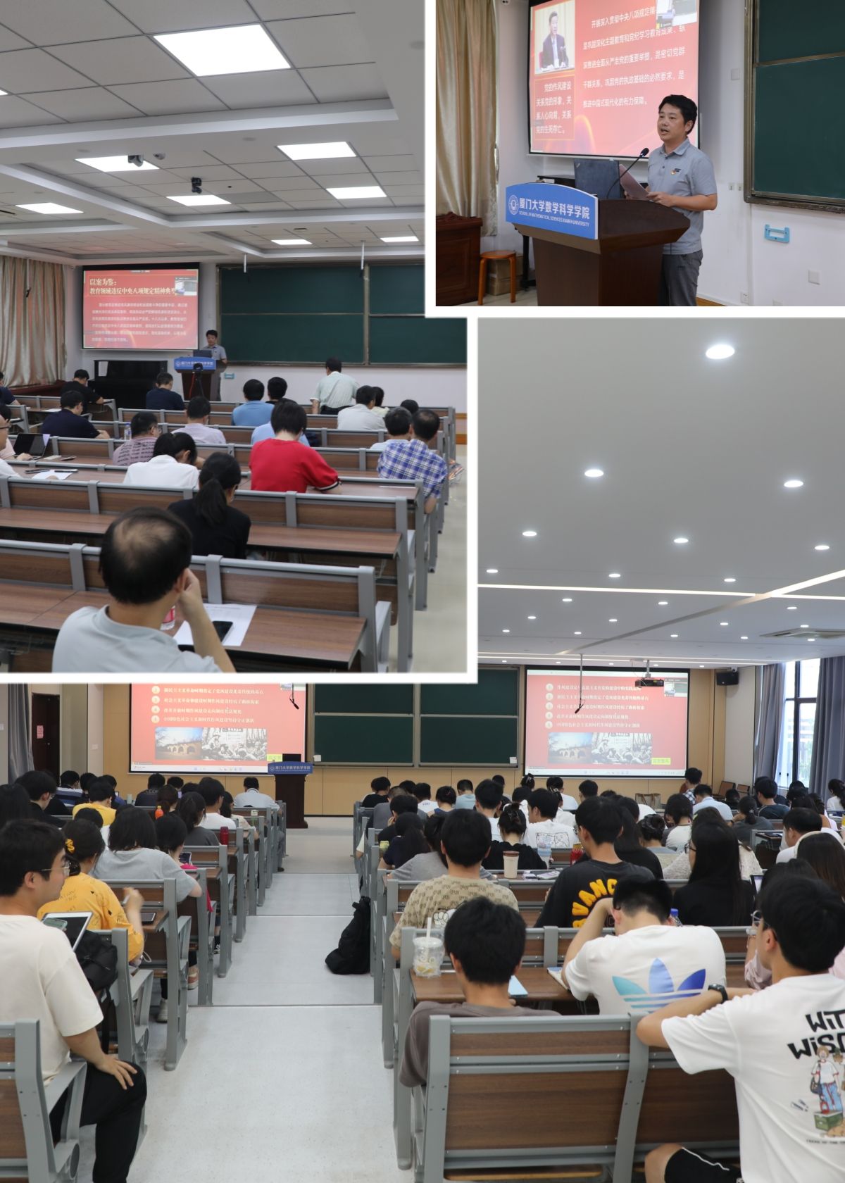 6月9日下午,数学科学学院开展2025年上半年师生党员集中培训专题教学,学院党委书记张清榕为全院师生党员作题为《深刻把握“三重逻辑”,推动作风建设常态化长效化》的报告。党课主会场设在海韵实验楼S103报告厅,同时在海韵实验楼S205报告厅设视频直播分会场,共计245名党员现场听取党课,学校基层党建工作联络员郑冰冰和部分师生通过线上参加。