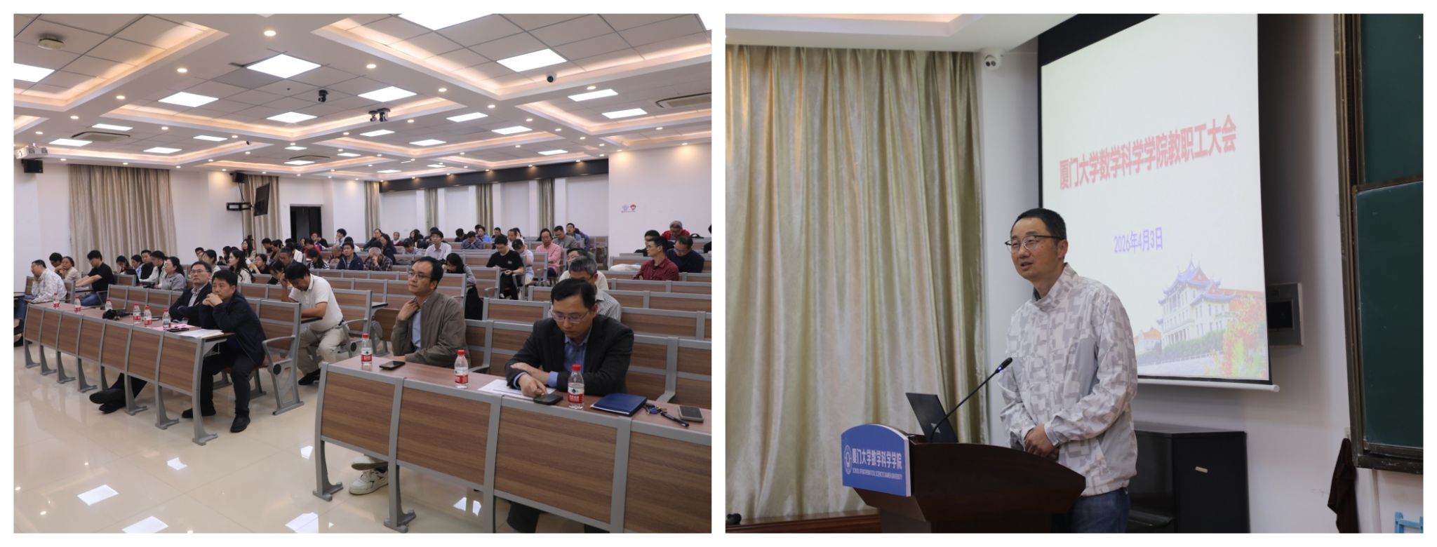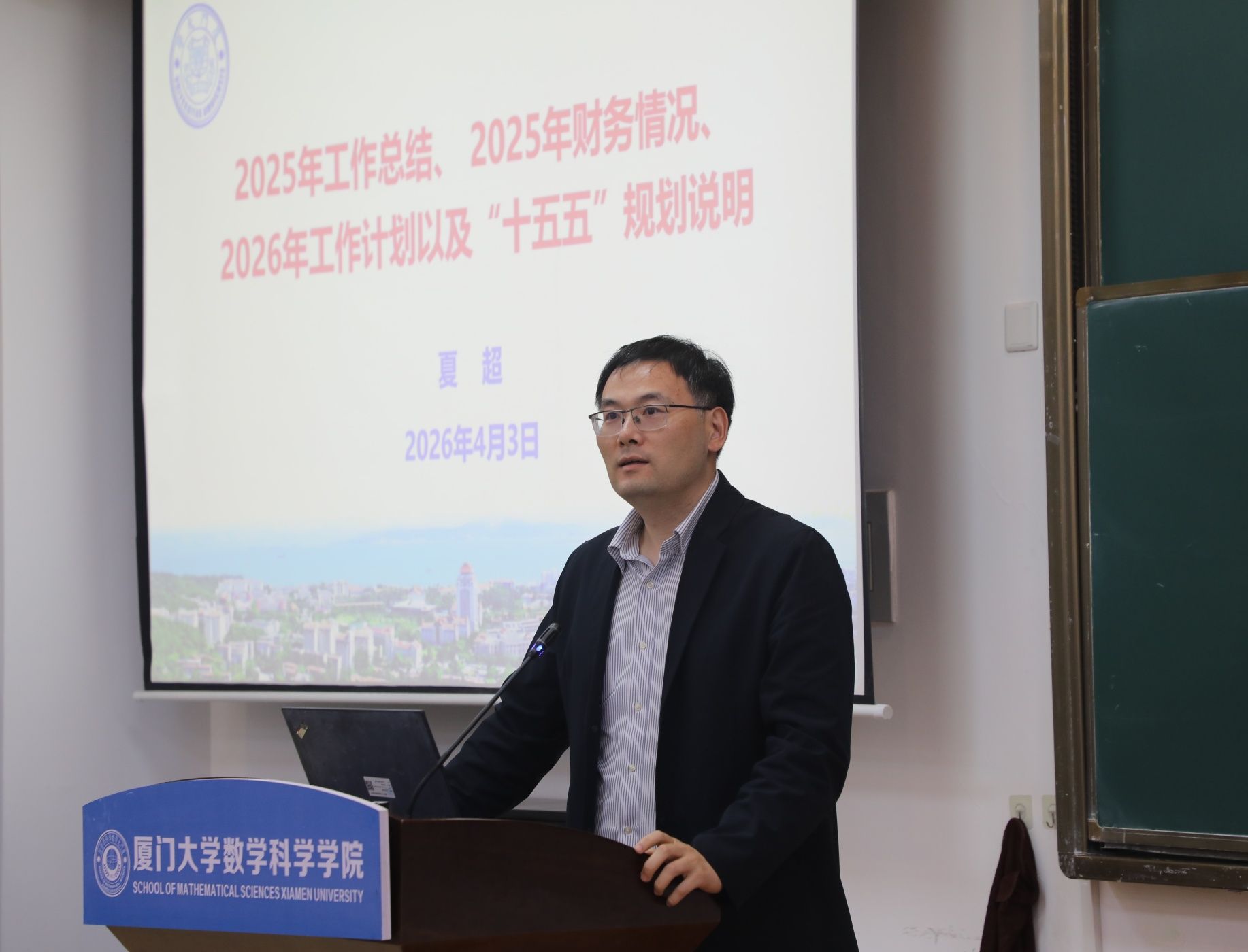 教职工大会由学院工会主席张文主持。夏超院长作学院年度行政、财务工作报告与“十五五”规划说明。他从学科建设、师资队伍、科学研究、人才培养、对外交流以及国家天元数学东南中心等方面全面总结了2025年发展成效,报告了2025年财务情况,并对2026年重点工作进行部署。他指出,过去一年学院各项事业取得了显著进展,学科整体实力稳中有升,新增2名国家高层次青年人才,获得教育部自然科学一等奖、福建省自然科学二等奖各1项,年度科研经费首次突破3000万元,获本科拔尖创新学生培养研究国家重点项目1项、福建省教学成果特等奖2项。他强调,要努力提升人才培养质量,打造若干品牌化学术讲座和数学文化活动,推动人才培养各环节协同增效;要全力建设一流师资队伍,多维度、多渠道做好引才工作,持续提升人才引育成效;要不断增强学科核心竞争力,重点建设核心数学领域国内领先、国际一流的优势研究方向,推动学科交叉融合,重视数学在高科技领域的应用;要全面深化对外交流合作,依托台海区域优势和马来西亚分校资源,努力拓展国际合作,积极推进学院中外合作办学项目。在财务工作报告中,他指出,2025年学院总体收支基本平衡,教师个人科研经费收入增长明显,但学院在整体办学经费方面仍面临较大压力,要积极争取多方支持,开源节流,依法合理高效使用经费。他从“十四五”规划执行情况、“十五五”面临的机遇与挑战、“十五五”核心目标和2035年远景目标、“十五五”指导思想和主要任务举措四个方面对学院“十五五”规划作了简要的说明。全体教职工以热烈的掌声一致通过夏超院长所做的报告。