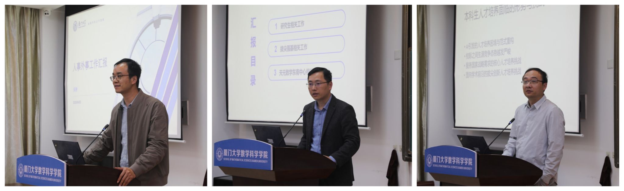 随后,宋翀、陈黄鑫和周达三位副院长先后汇报了人事、博士后、外事,研究生教育、“强基计划”、“拔尖计划”、国家天元数学东南中心,以及本科生培养、国内合作、校友等方面的工作进展及改革举措。