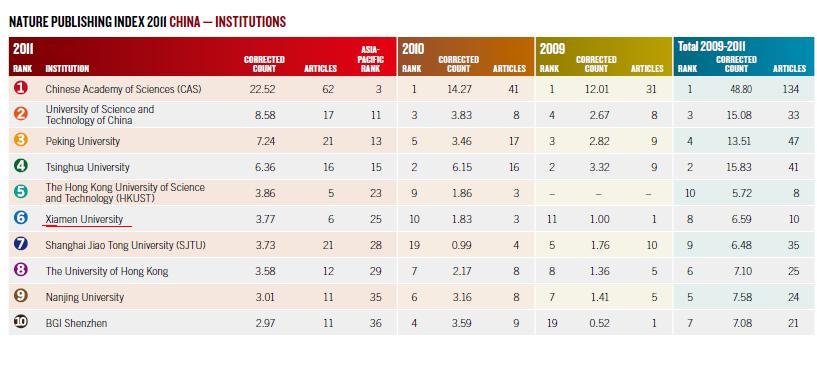 国际权威学术期刊——英国《自然》杂志日前发布《自然出版指数2011—中国》报告。报告显示,我校位列中国十大科研机构的第六位,厦门市则名列中国十大基础科研城市的第七位。与2010年相比,我校排名上升了3位,而厦门市则持平。