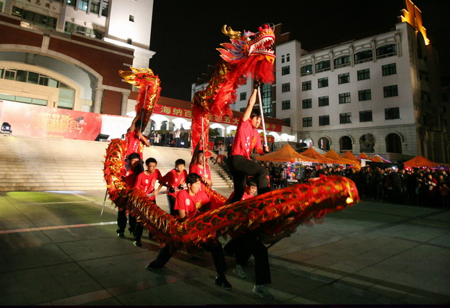活动一开始,艺术学院舞蹈队10名美丽俏皮的花旦们红红火火闹新年,立刻将现场师生们聚集到了一起,共同感受着节日的喜悦;紧接着,体育部舞龙队珠引龙腾,在广场上跳跃、扑腾、登高、翻转、踩球,更是博来观众们一阵阵热烈的掌声。穿插中间的竞技健美操表演和经济学院赖春燎老师的一曲《今夜无人入睡》,一次又一次地将活动推向高潮。各个部门工会精心准备了形式多样、精彩纷呈的小游戏,广场上人潮涌动,四处排起长龙,歌声与欢笑交融,灯火与霓虹辉映,喝彩与掌声共鸣,幸福和欢乐洒满了整个校园。