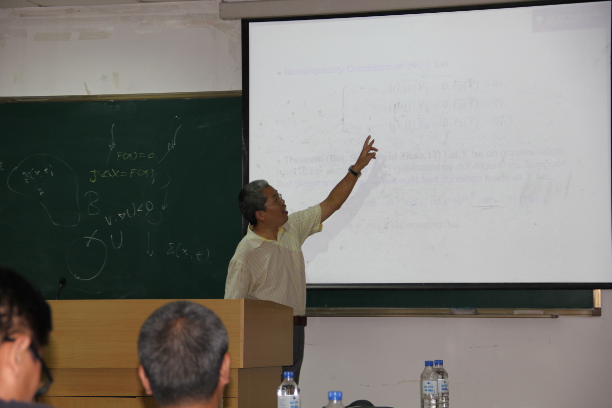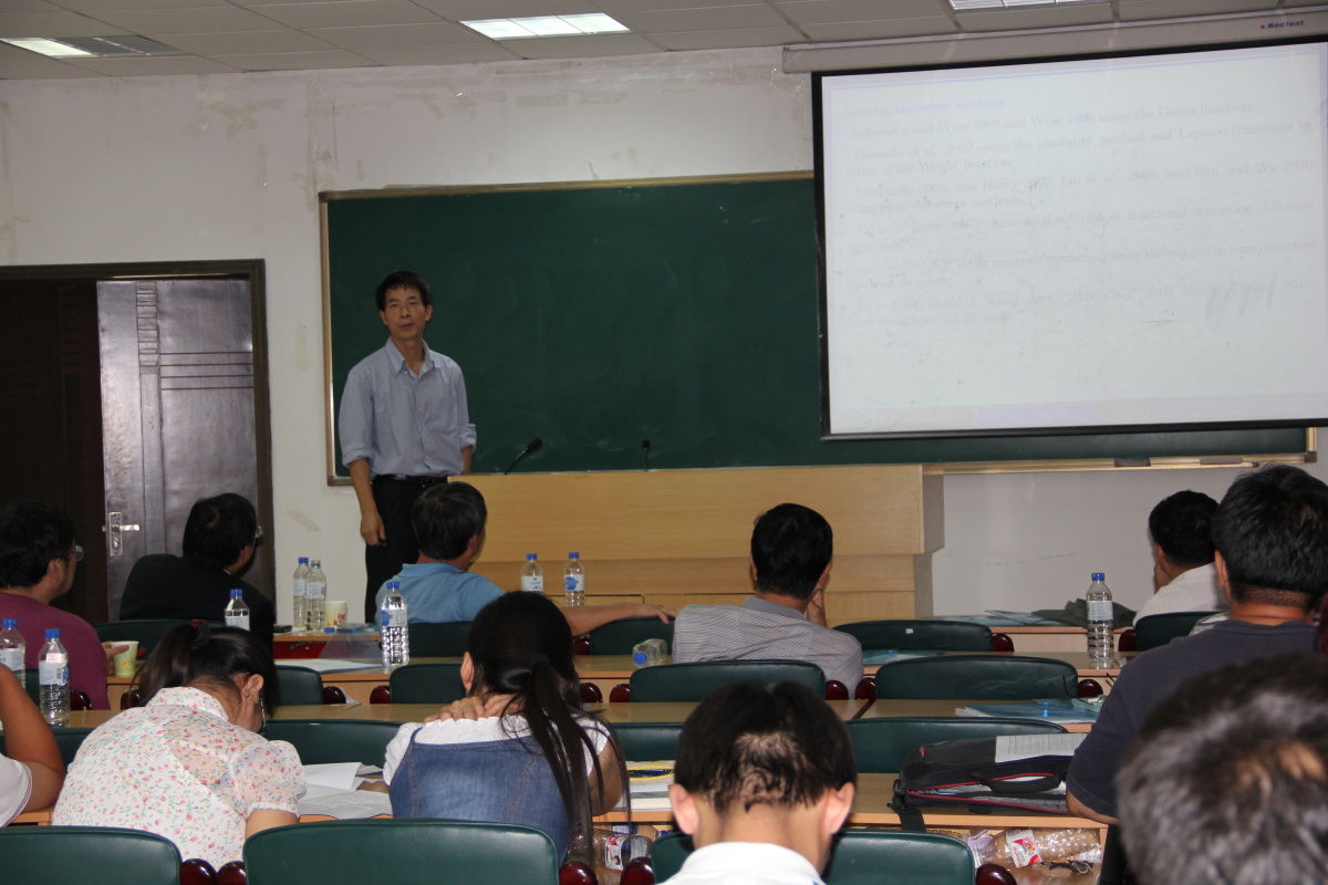 报告会上,我校8位专家作了8场的学术报告,分别是程金发教授的《分数阶差分方程理论》;李时银副教授的《随机波动率情况下的美式期权定价方法》;张莲珠教授的《图的Pfaffian性问题研究》;张志强教授的《模糊系统(Fuzzy System)在保险及精算中的应用》;赵俊宁教授的《Navier-Stokes方程的整体古典解》;白正简教授的《Nonnegative Inverse Eigenvalue Problem with Partial Eigendata》;邱建贤教授的《Weighted Essentially Non-Oscillatory limiters for Runge-Kutta Discontinuous Galerkin Methods》; 许传矩教授的《Numerical Solutions of the Fractional Differential Equations》。
