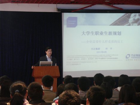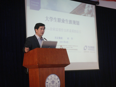 在这一个半小时的演讲时间里,叶平先生以自己的成功经历和经验总结,介绍了怎样才能做好职业生涯规划,解读了方正集团的人才素质模式,分析了企业需要什么样素质的员工,并给大学生提出了的几点建议。叶平先生结合了自己当年决定离开高校,下海择业的选择过程和求职应聘的技巧,鼓励同学们要知己知彼,合理规划自己的职业目标,并为实现目标付出各种努力,做好各种准备。他希望同学们像一名自由职业者那样思考,像一名运动员一样训练,像一名营销人员那样做好准备,像企业家那样投入工作。讲座中,叶平先生讲述了自己成长和工作中发生的几个故事,告诫同学们从现在起要注意培养从小事做起,要学好专业知识,要注重细节,要富有责任心,要有与时俱进的创新精神。通过讲解方正集团的人才素质模式体系,勉励同学们要珍惜机会,努力提高自身素质,成为满足社会需要的人才。他还提醒同学们步入职场后应该注意的一些问题,提出自己的看法和意见。