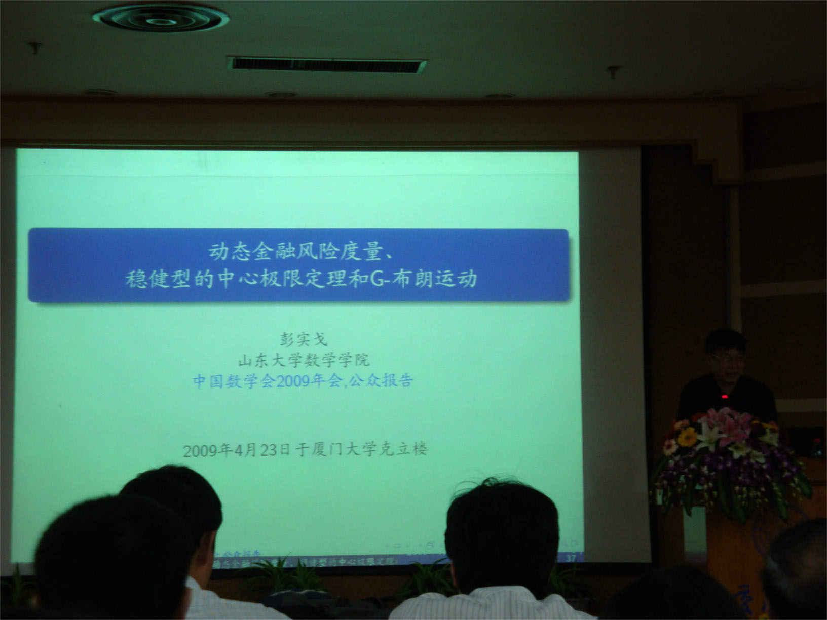 4月23日下午16:30,前来我校出席中国数学会2009学术年会的中国科学院院士、山东大学数学与系统科学学院博士生导师、国家级高层次人才彭实戈教授在克立楼三楼报告厅为我校师生做了题为“动态金融风险度量,稳型中心极限定理和G-Brown运动”的演讲。这是本次数学年会院士公众演讲厦大专场的第三场。数学科学学院院长林亚南主持本场演讲。
