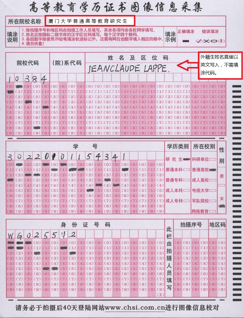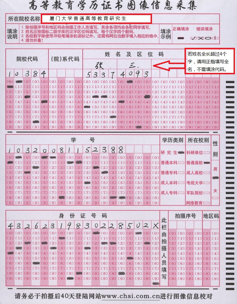 五、关于采集工作。研究生拍摄图像之前应严格按照填涂说明、准确无误地填写填涂卡,否则责任自负(可参看附图)。