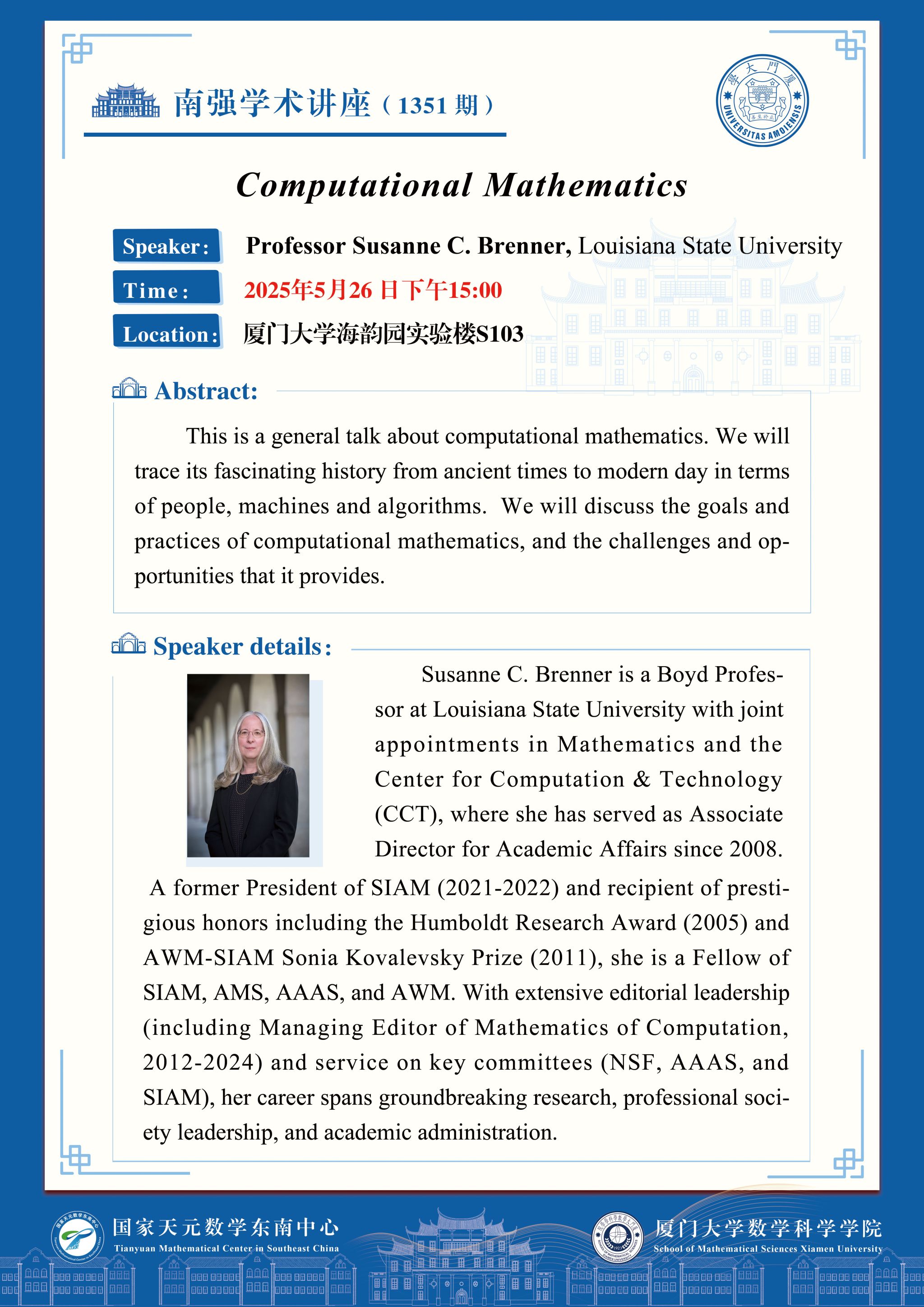 Speaker details:Susanne C. Brenner is a Boyd Professor at Louisiana State University with joint appointments in Mathematics and the Center for Computation & Technology (CCT), where she has served as Associate Director for Academic Affairs since 2008. A former President of SIAM (2021-2022) and recipient of prestigious honors including the Humboldt Research Award (2005) and AWM-SIAM Sonia Kovalevsky Prize (2011), she is a Fellow of SIAM, AMS, AAAS, and AWM. With extensive editorial leadership (including Managing Editor of Mathematics of Computation, 2012-2024) and service on key committees (NSF, AAAS, and SIAM), her career spans groundbreaking research, professional society leadership, and academic administration.