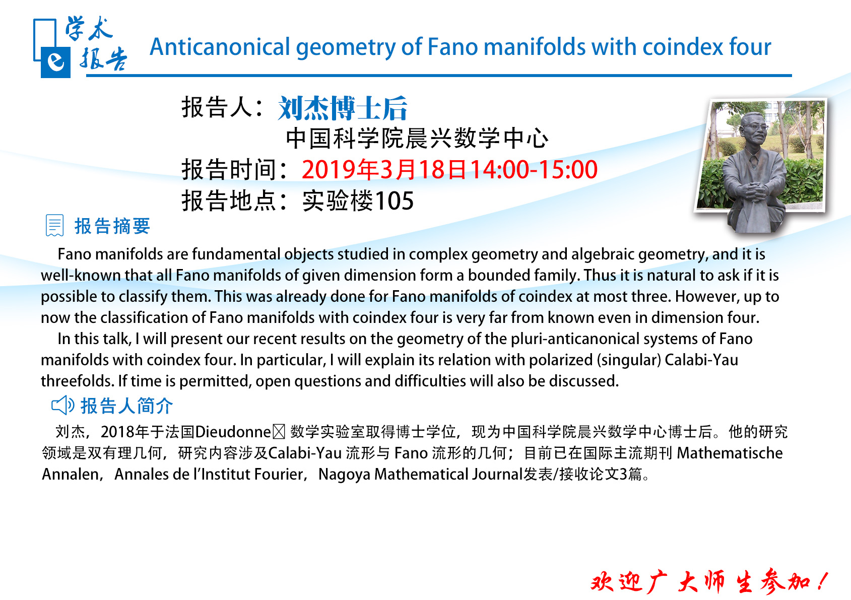 刘杰,2018年于法国Dieudonné 数学实验室取得博士学位,现为中国科学院晨兴数学中心博士后。他的研究领域是双有理几何,研究内容涉及Calabi-Yau 流形与 Fano 流形的几何;目前已在国际主流期刊 Mathematische Annalen,Annales de l'Institut Fourier,Nagoya Mathematical Journal发表/接收论文3篇。