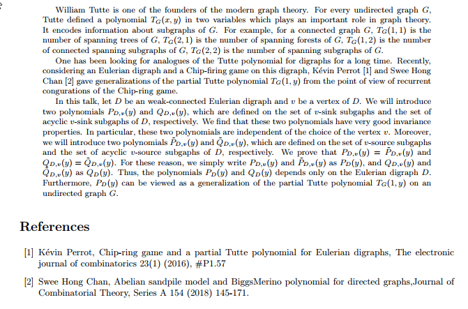 报告人简介:马俊, 2006年从上海交通大学数学系博士毕业, 后2006年至2009年,在台湾中研院数学所从事过为期三年的博士后研究工作,2010年到上海交通大学工作, 现为上海交通大学数学科学学院副教授, 主要研究组合设计与编码、代数组合、计数组合学及其应用等方面的问题。最近几年,研究主要围绕在图上的多项式(尤其是图的Tutte多项式)的性质、计算、推广,及其与图上其他相关组合结构之间的关系, 如与图的生成树、与图上泊车函数和与图上沙堆模型的关系上, 得到了一系列的成果。