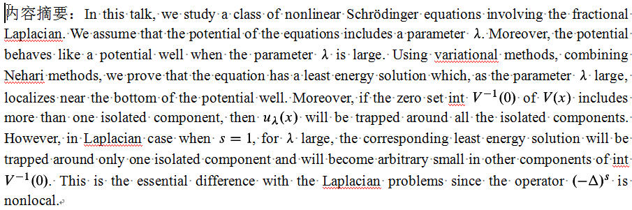 报告题目:Least energy solutions of fractional Schrödinger equations involving potential wells
