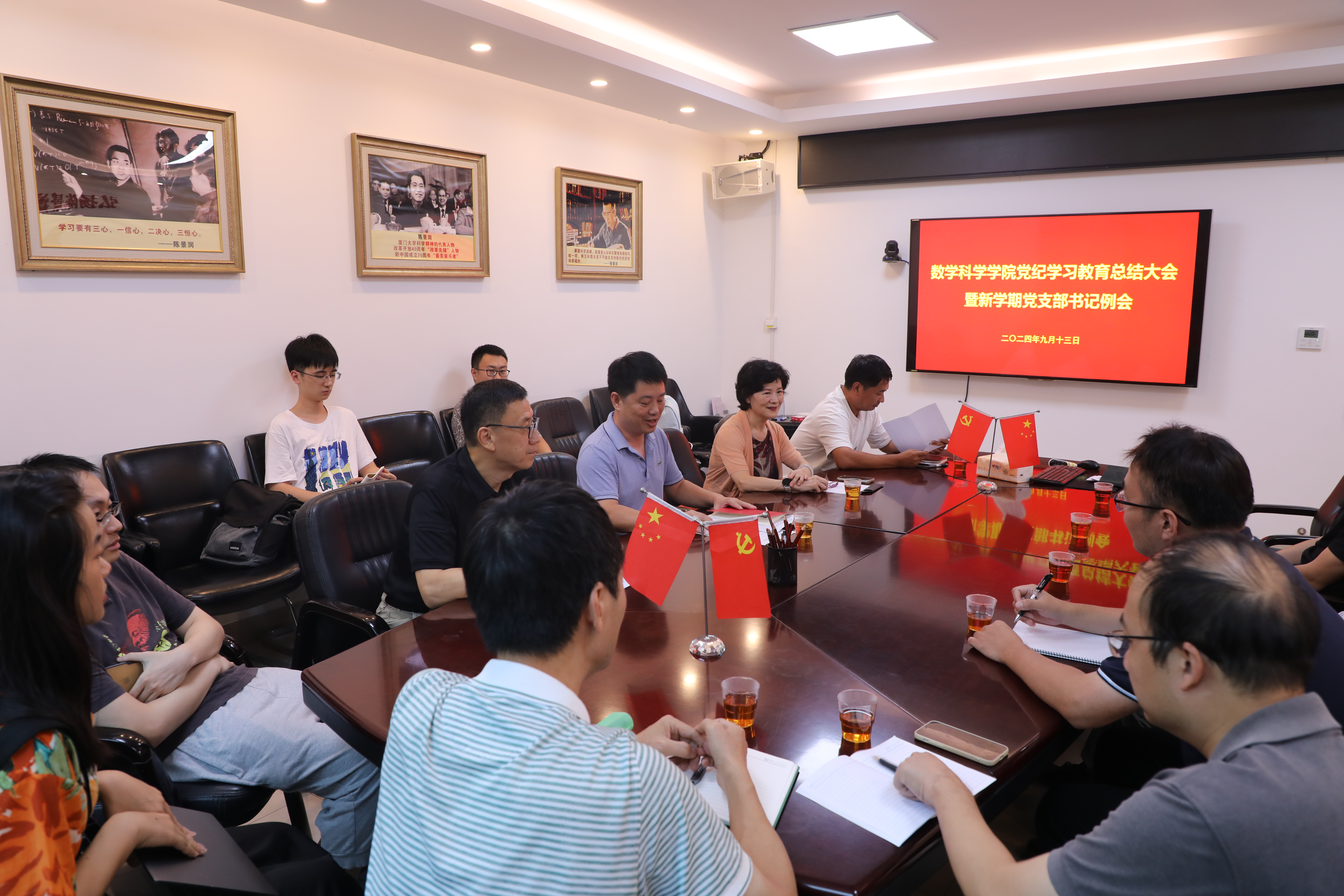 9月13日下午,数学科学学院召开党纪学习教育总结会暨新学期党支部书记例会。厦门大学基层党建工作联络员郑冰冰,院党委书记张清榕,院党委副书记毛通双,院党委委员、副院长朱玉峻,院党委纪检委员张文出席,全体党支部书记参加会议。会议由张清榕主持。