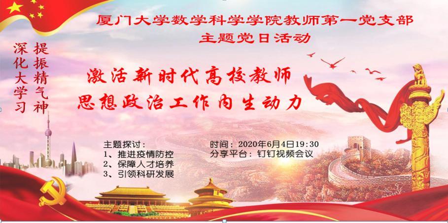 6月4日晚上教师第一党支部在钉钉平台上进行了线上政治理论学习,开展主题党日活动,巡察组的成员杨云良同志和联络员郑建斌同志参加了会议。党员们认真学习了习近平总书记关于疫情防控和经济社会发展重要讲话,结合所学习的理论,大家根据自身实际情况讨论了如何激活新时代高校教师思想政治工作内生动力的问题。党员们积极发言,联系自己的岗位工作和生活实际畅谈如何以优良党风引领校风学风,在关键之年展现关键作为。其中支部党员林亚南教授向大家传授他在教育战线上始终坚持立德树人的宝贵经验,王清教授则与大家分享了脚踏实地,引领科研发展的思路和感想,引发了大家深刻思考和热烈讨论。支部联系领导张剑文副院长作总结,他鼓励大家要在抗击疫情的同时,集思广益,高质量的完成教学科研任务。大家表示,一定要群策群力,将支部建设成为红色引擎、育人堡垒和科研硬核,以实际行动来践行我们的初心使命。