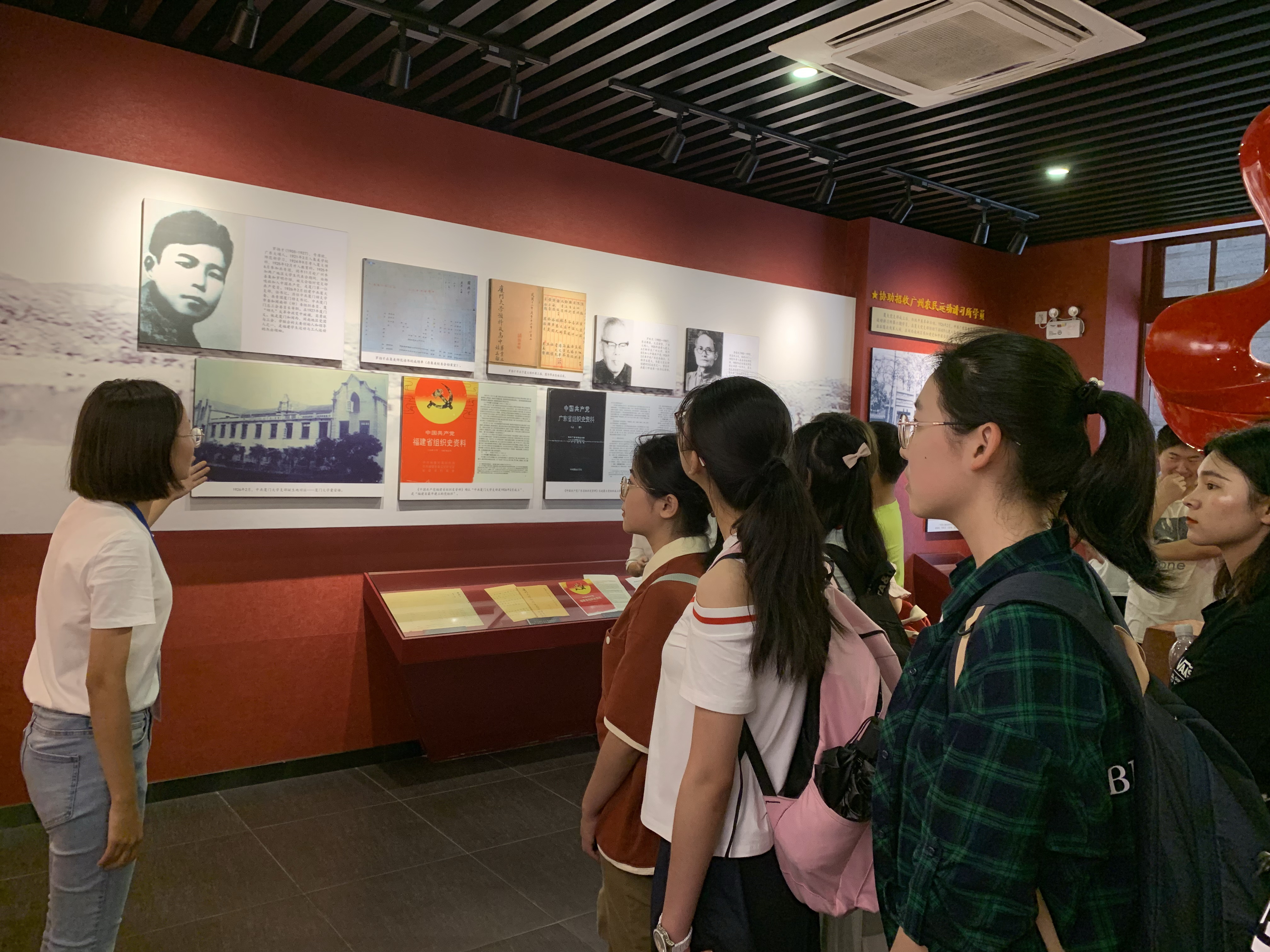 展馆第一单元为“八闽革命摇篮”,介绍的是福建省第一个党组织、中共厦门大学支部诞生地——囊萤楼。支部的成立,标志了厦门人民革命运动进入了新时期,也揭开了福建省党史的新篇章。第二单元“坚持红旗永不倒”讲述了厦大党支部在第二次国内革命战争期间的相关历史,积极分子及党员们细心聆听讲解后对这一历史有了更深的了解。第三单元“抗日救亡基地”讲述的是厦大在抗日战争期间的历史,青年学子投笔从戎,奔赴前线,血洒疆场。最后一单元“东南民主堡垒”讲述了厦大在解放战争时期的相关历史。