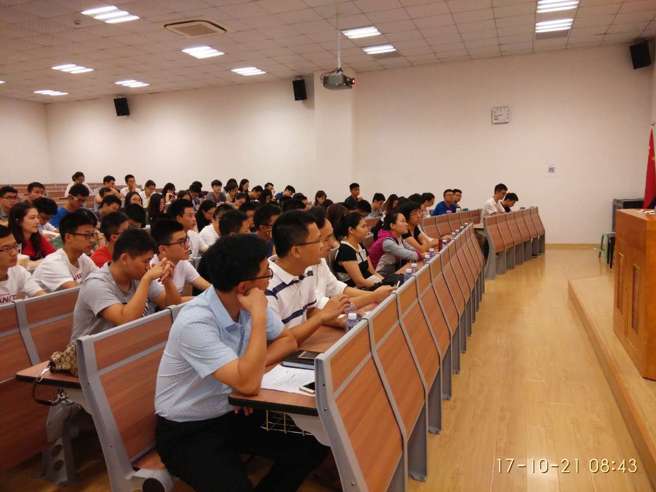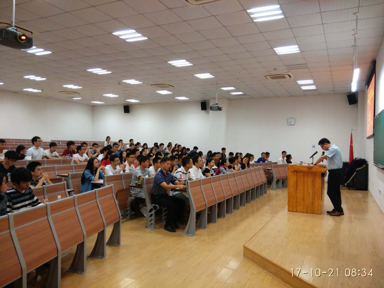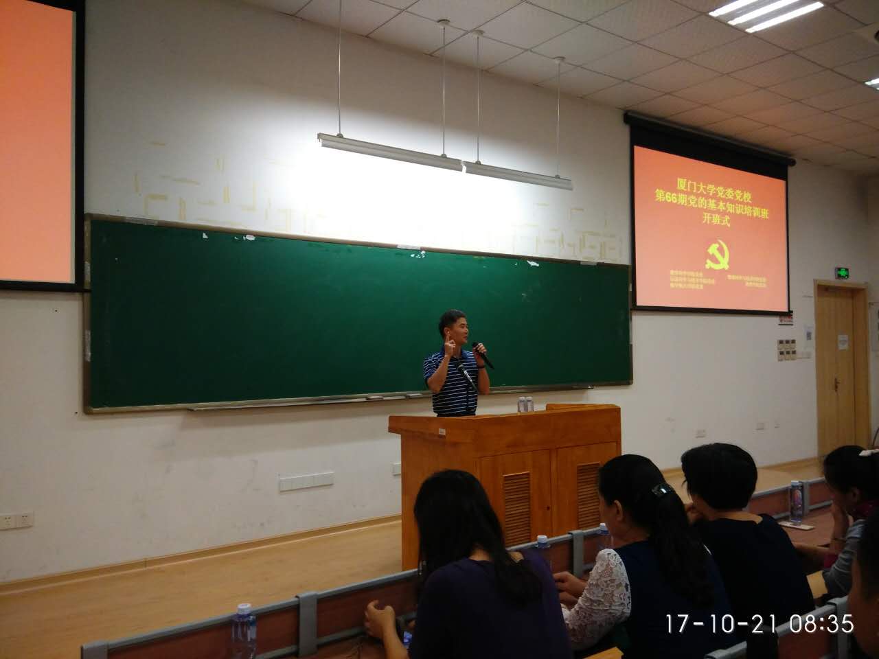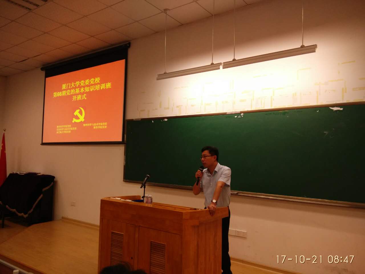 2017年10月21日上午,党委党校第66期党的基本知识培训班开班式在数理大楼117教室举行。本期培训班承办学院数学科学学院党委书记张明智作动员讲话,物理科学与技术学院党委副书记张秀丽、软件学院党委副书记刘钟南、信息科学与技术学院党委副书记李承华出席开班式,数学科学学院党委副书记张剑文主持开班式。参加开班式的还有党校带队教师和119名新学员。