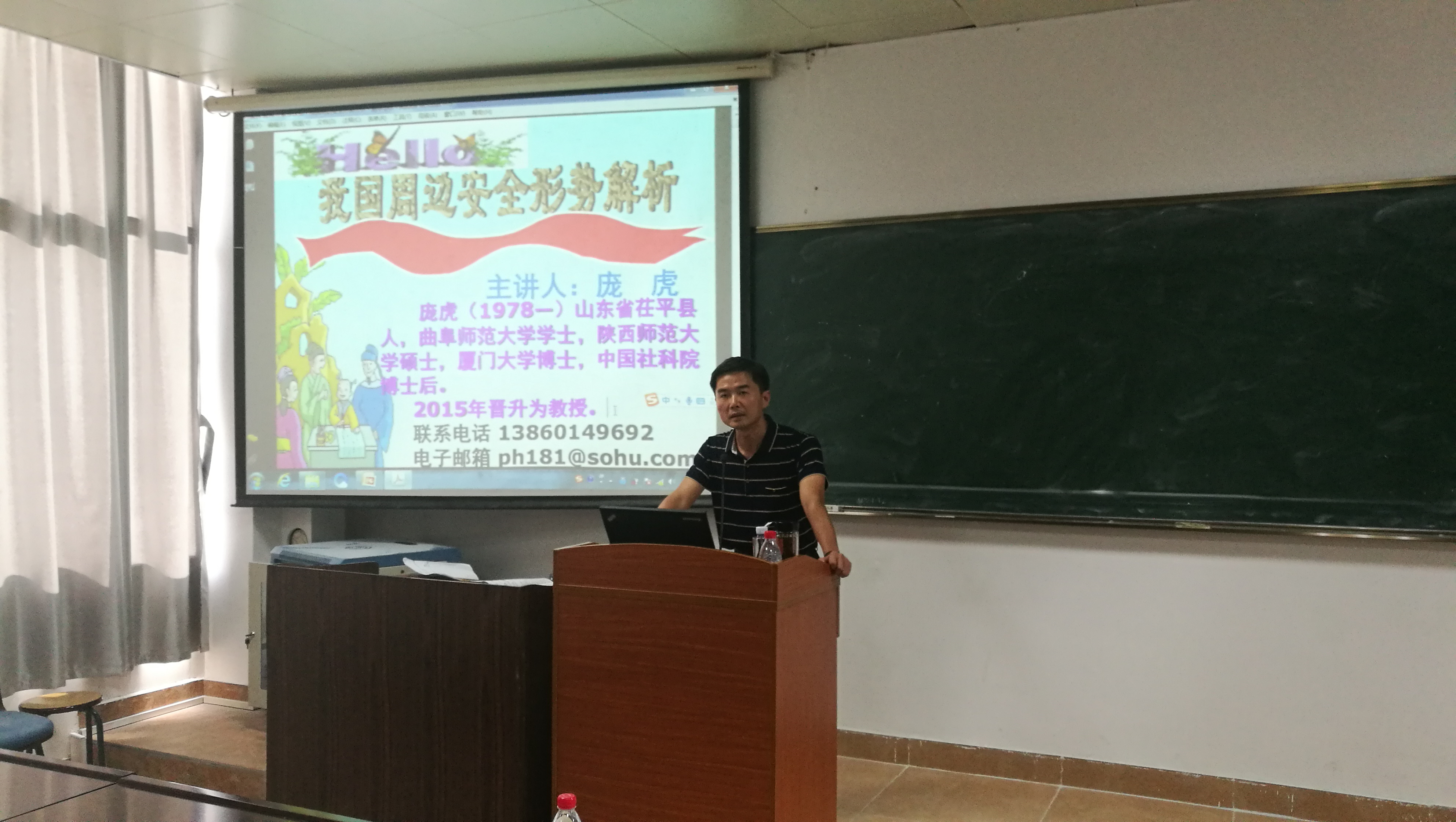 庞虎教授报告主题为《我国周边安全形势解析》。他围绕“周边邻国情况复杂”、“霸权主义阴魂不散”、“世界大战蓄势待发”等三个问题,对我国周边安全情况进行总体介绍,又以“东线”“西线”“南线”为切入,对周边安全面临问题作具体分析。报告结合“一带一路”“钓鱼岛事件”、“南海争端”和“中印领土争端”等多个国际热点,全面展现以习近平同志为核心的党中央在新时期建立的“强化制裁”“扩大对外影响”“持续爱国主义”等周边安全新思路。报告旁征博引,内容涉及政治、经济、文化、历史等多个方面,全方位、多角度、深层次地阐述了我国周边安全形势,并提出一系列应对策略。