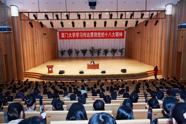 11月27日、28日,学校先后在校本部和翔安校区召开会议传达学习党的十八大精神,并就全校学习宣传贯彻党的十八大精神工作进行动员部署。校党委书记杨振斌强调,学习党的十八大精神一定要原原本本、认认真真、深刻理解,要把党的十八大精神的学习贯彻与学校和本单位的实际紧密结合起来,以实实在的行动和成效贯彻落实好党的十八大精神,推动学校各项事业取得新发展。