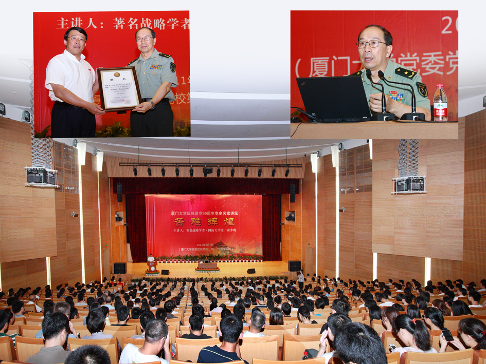 6月7日下午,科学艺术中心三楼报告厅座无虚席,国防大学战略研究所所长、博士生导师金一南少将做客我校庆祝建党90周年党史名家讲坛暨党委党校第89、90、91期学习班专场报告会,做题为《苦难辉煌:对国家和民族命运的思索》的报告。国防大学训练部教务部副部长尹俊、我校校领导、校长助理,厦门市警备区领导,全校副处级以上干部,理论报告员,思想政治理论课教师,教工党支部书记,党务秘书,辅导员,学生党支部书记,国防生代表,学生代表近1000人共同聆听了这场时长两个半小时的精彩报告,金一南生动深刻的讲述使会场不时爆发出热烈的掌声。