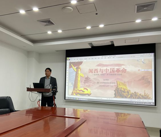 12月17日中午,在数理大楼6楼天元会议室,学院副院长金贤安教授参加数学科学学院硕士应用数学党支部主题党日活动。本次活动内容丰富,包括“闽西与中国革命”主题党课、重温入党誓词、庆预备党员政治生日等多个环节。